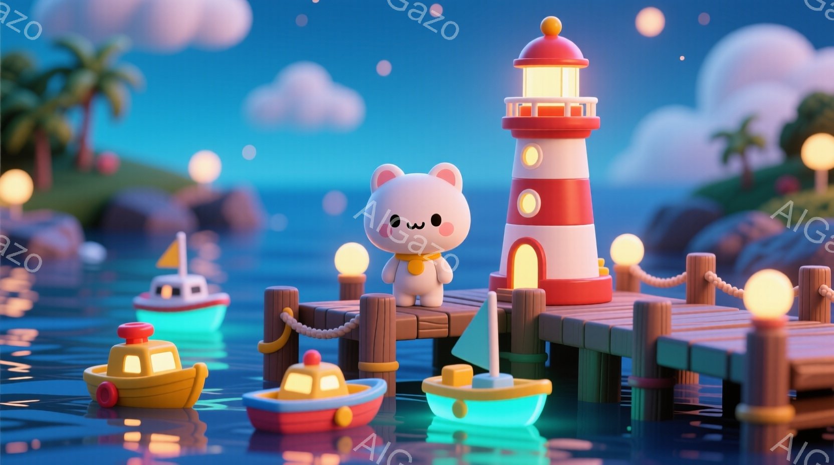 暖かく優しい雰囲気のイラストで、可愛らしいクリーム色の小動物が灯台のそばに立っています。その動物は赤いスカーフを巻き、嬉しそうな表情で両手を前に出して何かを見ているようです。背景には、柔らかい色合いの波と、星空が広がり、穏やかな夜の海を表現しています。