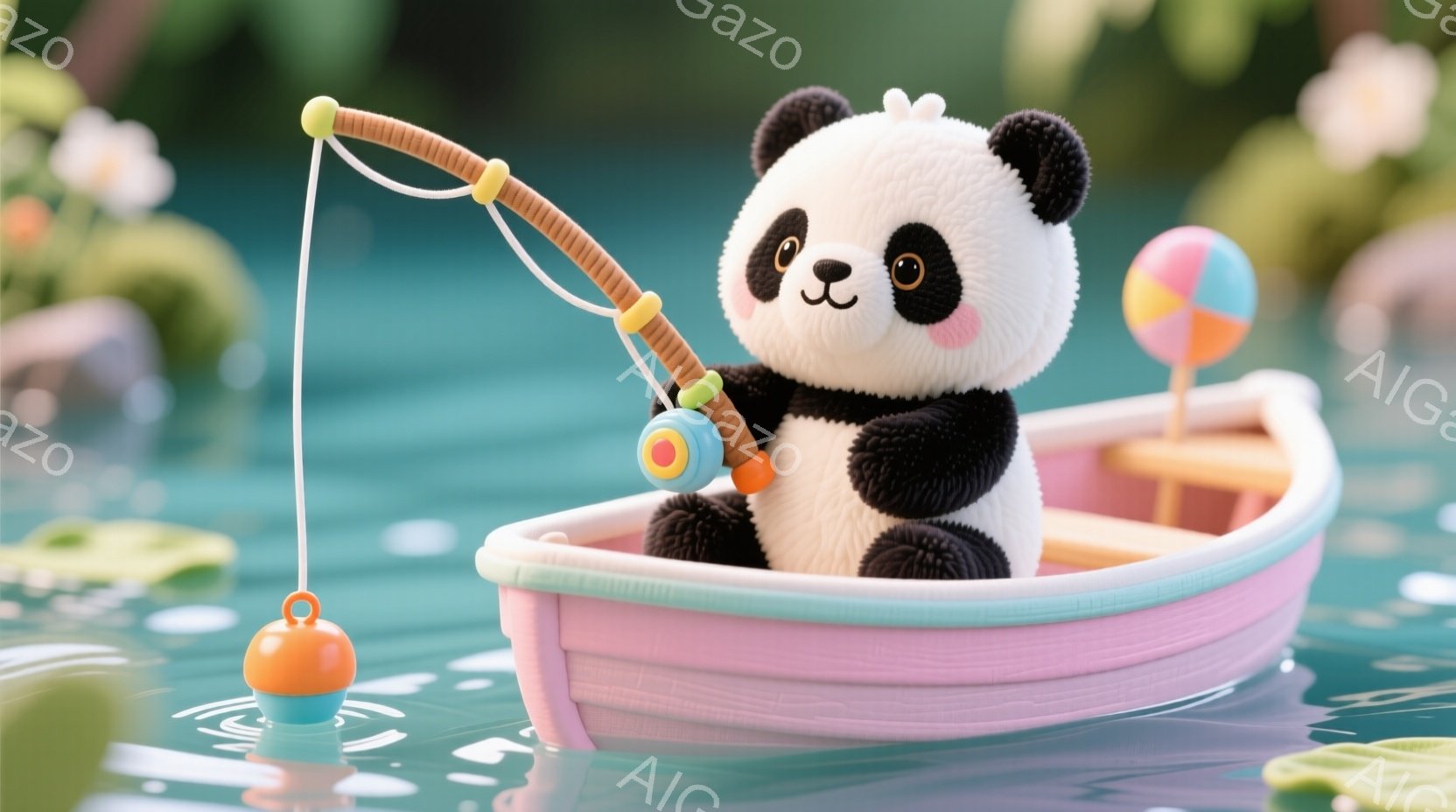 ふわふわのパンダが、ピンク色の小さなボートに乗って釣りを楽しんでいます。パンダは黒い目と鼻、つぶらな頬で愛らしい表情をしており、集中して釣竿を握っています。背景には水面と緑の植物が見え、穏やかで平和な雰囲気が漂っています。