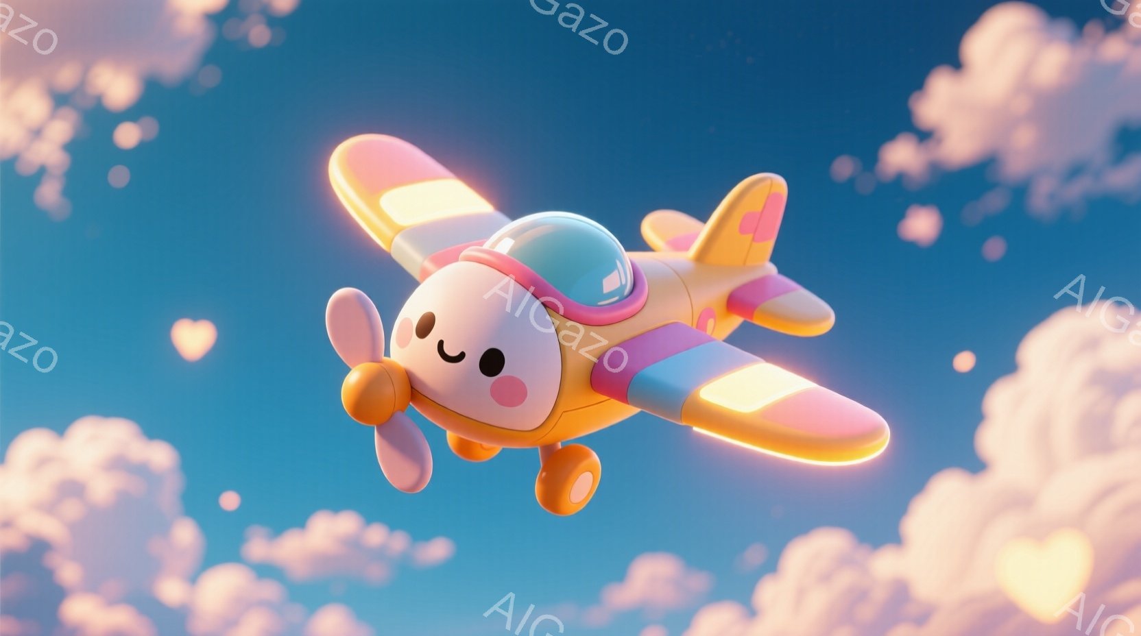 明るい青空を飛ぶ、可愛らしいカートゥーン調の飛行機を描いています。飛行機は白を基調とし、オレンジと水色のアクセントがあり、まるで生きているかのように、顔やプロペラが特徴的です。背景には、ふわふわとした雲が広がり、全体的に夢見心地で温かい雰囲気が漂っています。