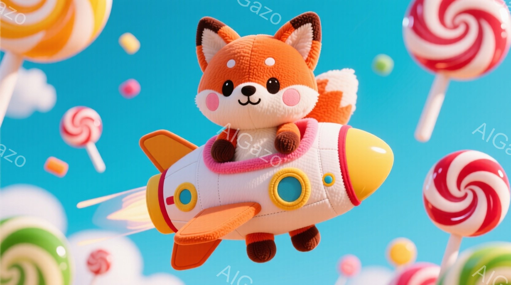 キツネのキャラクターが、レトロなデザインの飛行機型乗り物に乗って空を飛んでいます。キツネはオレンジ色のセーターを着ており、嬉しそうな表情をしています。背景には、カラフルなキャンディーやふわふわとした雲が浮かび、夢のような雰囲気を作り出しています。
