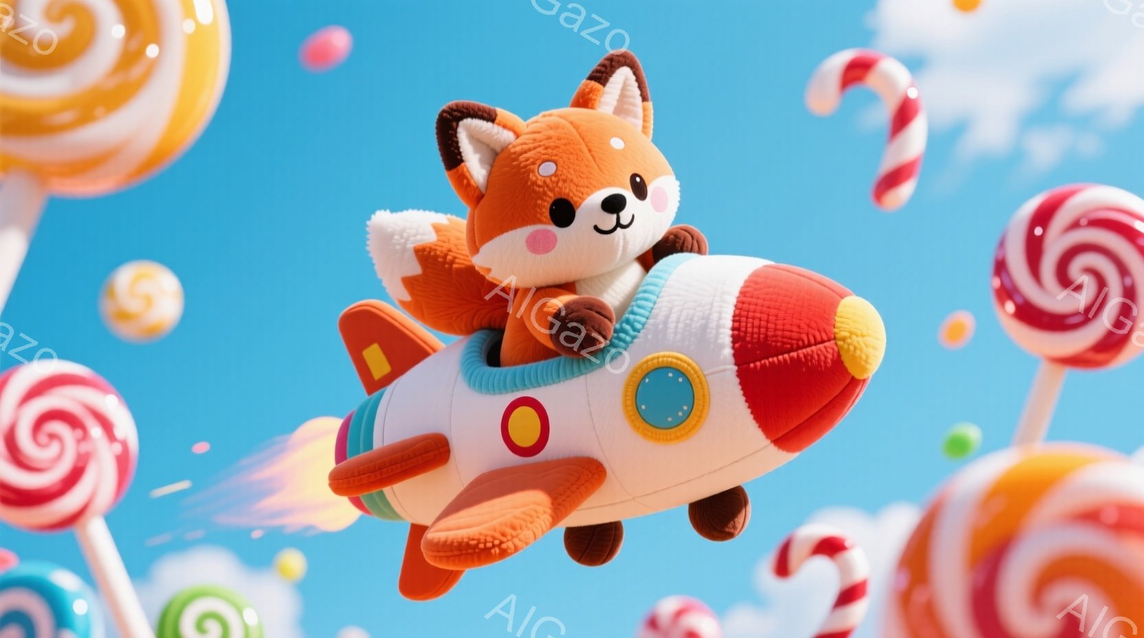 明るい青空を背景に、愛らしいキツネがロケットに乗って飛んでいる様子が描かれています。キツネはオレンジ色で、大きな黒い目で可愛らしい表情を浮かべており、ピンク色の頬が可愛らしさを引き立てています。背景にはカラフルなキャンディやふわふわした雲が浮かび、夢のような、楽しげな雰囲気を醸し出しています。