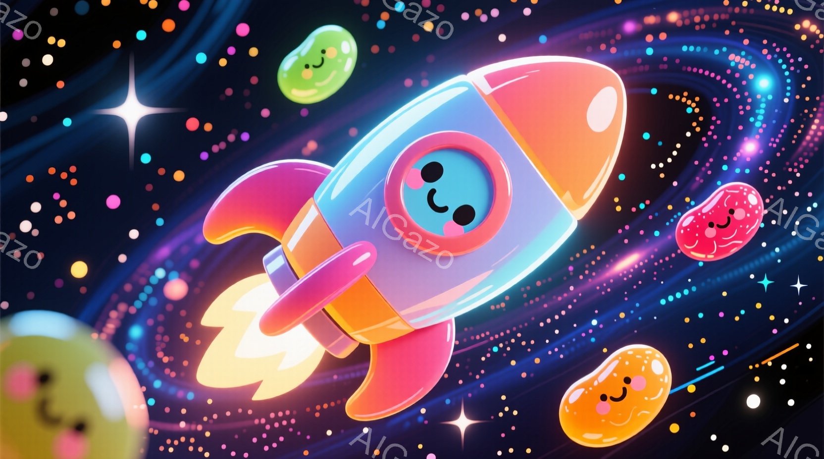 鮮やかなピンクと紫色のロケットが、燃え盛るオレンジ色の炎を噴き出しながら宇宙空間を飛んでいる様子が描かれています。ロケットには愛らしい顔が描かれており、親しみやすい表情で楽しそうに飛び回っています。背景には、様々な色の星や惑星が散りばめられ、夢幻的な雰囲気を醸し出しています。