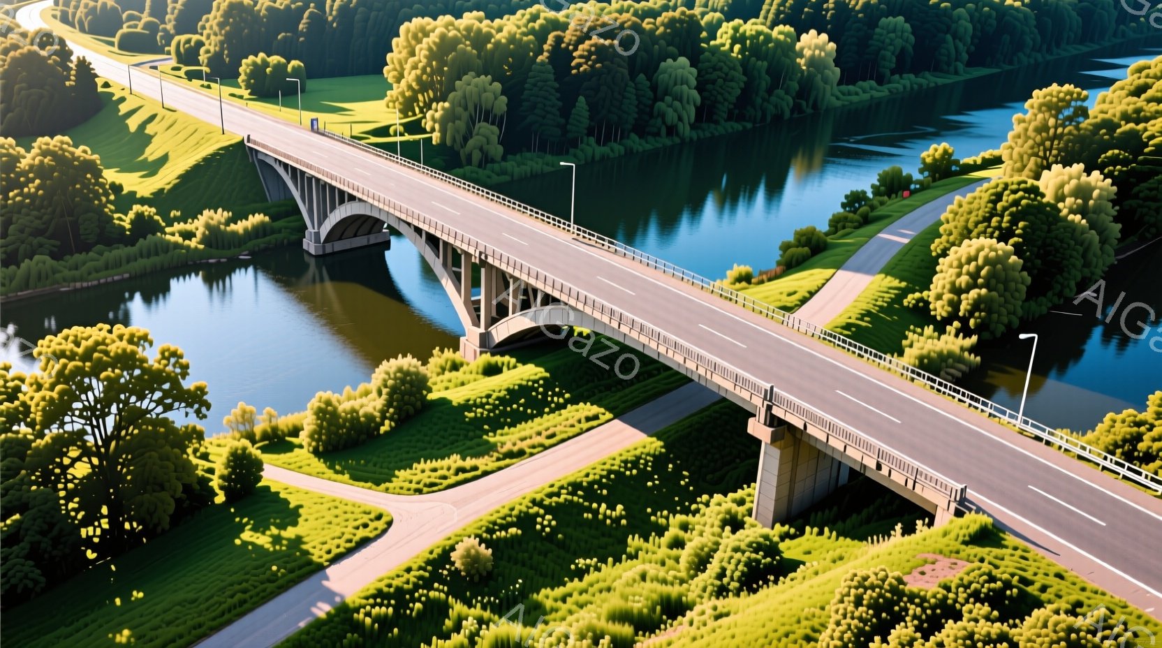 広大な緑の草原と青い川を背景に、緑色のアーチ橋が印象的な風景です。高速道路と歩道が並び、その先には植物が生い茂り、澄んだ空と穏やかな水面が広がっています。全体的に、静かで平和な夏の日の光景が描かれています。