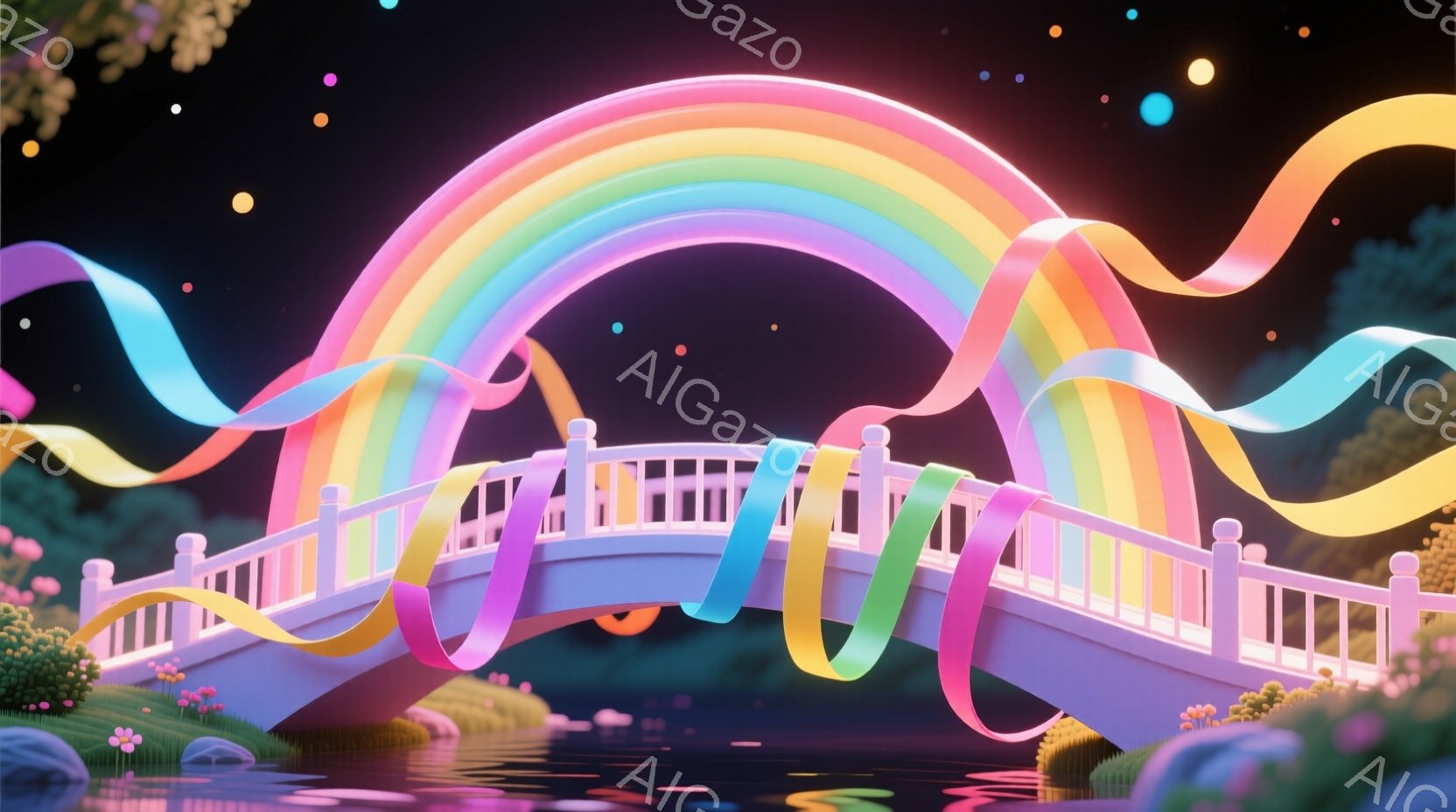 鮮やかな色彩の虹色のリボンがアーチを描き、ピンク色の可愛らしい橋を飾っています。夜の背景には、ぼんやりとした光を放つ植物と、水面に反射する光が幻想的な雰囲気を醸し出しています。全体的に、夢のような、遊び心溢れる世界観が表現されています。