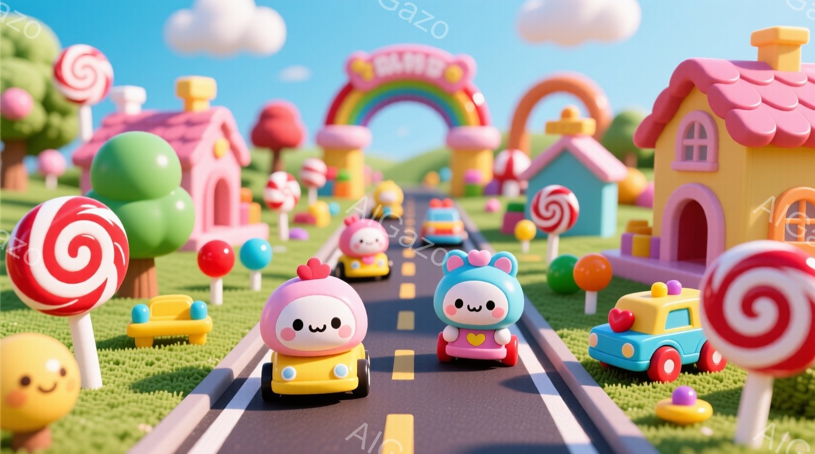 ピンク色の道路を可愛らしいキャラクターが運転するピンク色の車が疾走している様子が描かれています。背景には、キャンディやカラフルな建物が立ち並び、まるで夢のようなお菓子の国を思わせます。全体的にパステルカラーで統一されており、暖かく、遊び心あふれる雰囲気です。
