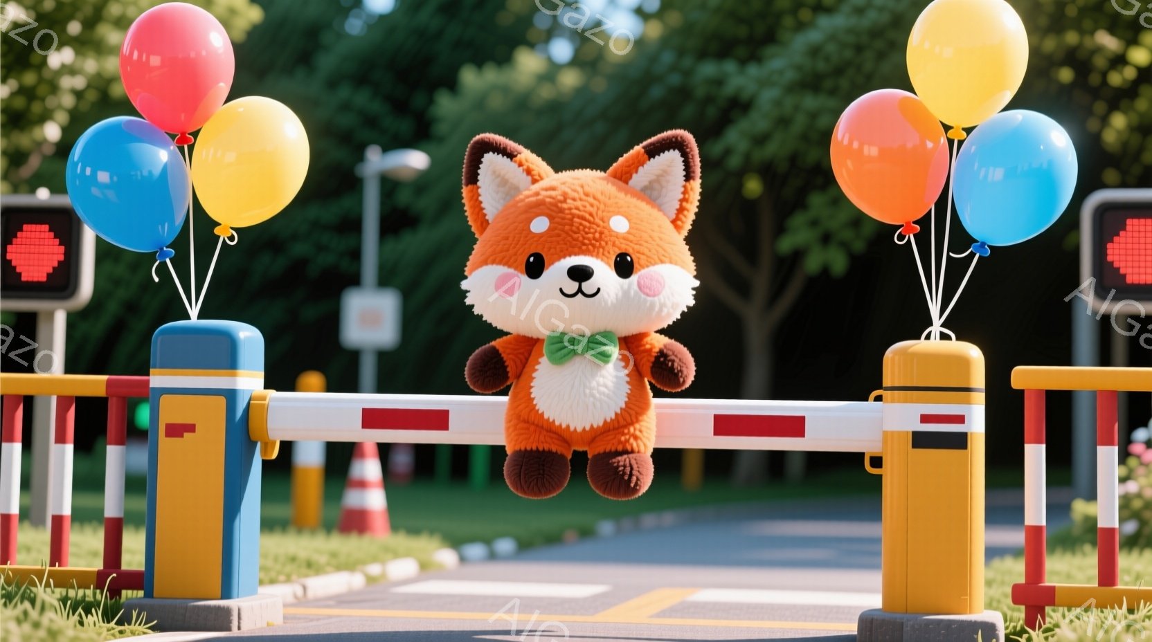 ふわふわのオレンジ色のキツネが、白い柵にまたがって座っています。キツネは大きな瞳で穏やかに微笑み、頭にはふわふわの毛並みが特徴的です。背景には緑の芝生と道路があり、カラフルな風船がキツネの周りを彩り、明るく楽しい雰囲気を醸し出しています。