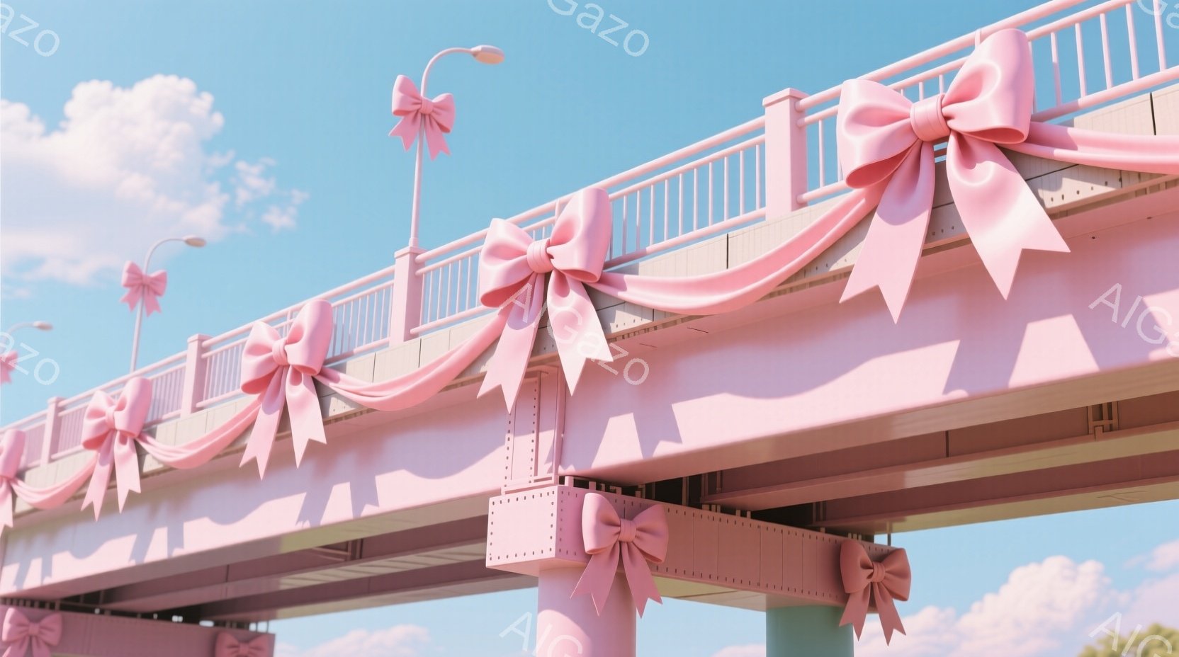 高架橋がピンクのリボンで飾られており、まるでプレゼントのように見える。背景には青空が広がり、穏やかな天候であることがわかる。全体的に柔らかい色調で、華やかで夢のような雰囲気を醸し出している。