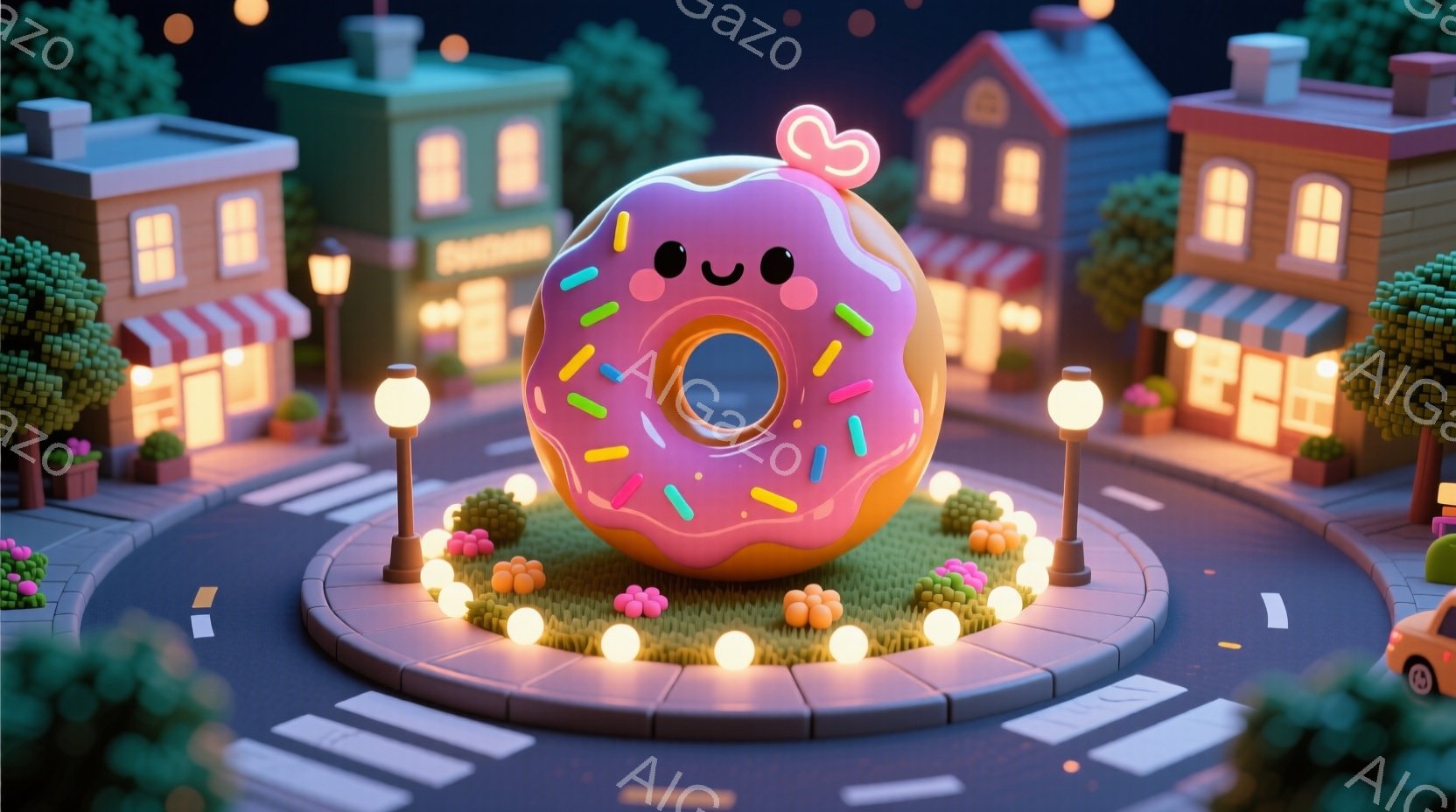 ピンク色のドーナツが街の中心にある円形の広場に置かれ、まるで彫刻のように楽しげに微笑んでいます。 周囲にはカラフルな植物が植えられ、道路には白いラインが引かれ、夜の街並みが明るい街灯によって照らされています。 全体的に、おとぎ話のような、温かく、遊び心のある雰囲気を感じさせます。