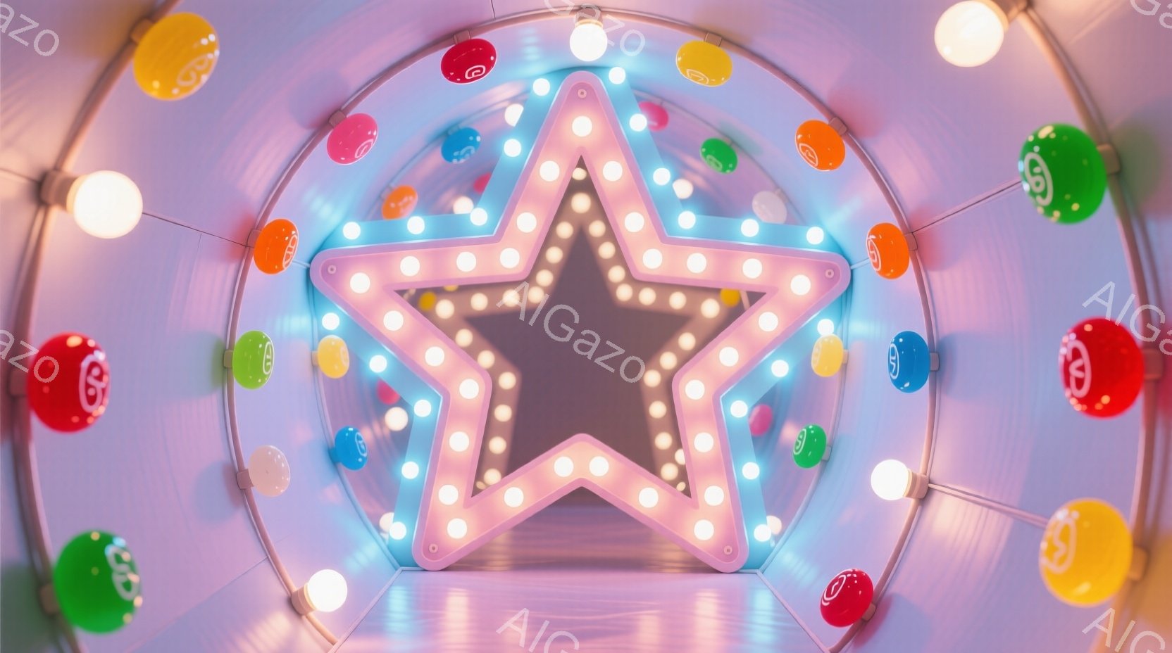 白を基調としたトンネルのような空間に、大きな星形のライトが中央に輝いている。星形ライトの周囲には、様々な色の丸い光が規則的に配置され、まるでキャンディーのような装飾が施されている。全体的に、夢のような、遊び心に満ちた、幻想的な雰囲気が漂っている。