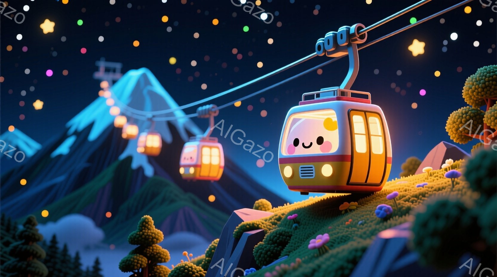 可愛らしいケーブルカーが夜空を舞台に描かれています。ケーブルカーはオレンジと紫色のカラフルな配色で、正面には笑顔の顔が描かれています。背景には雪を頂いた山々と、カラフルな草花が生い茂る丘が広がり、まるで絵本のような幻想的な雰囲気を醸し出しています。