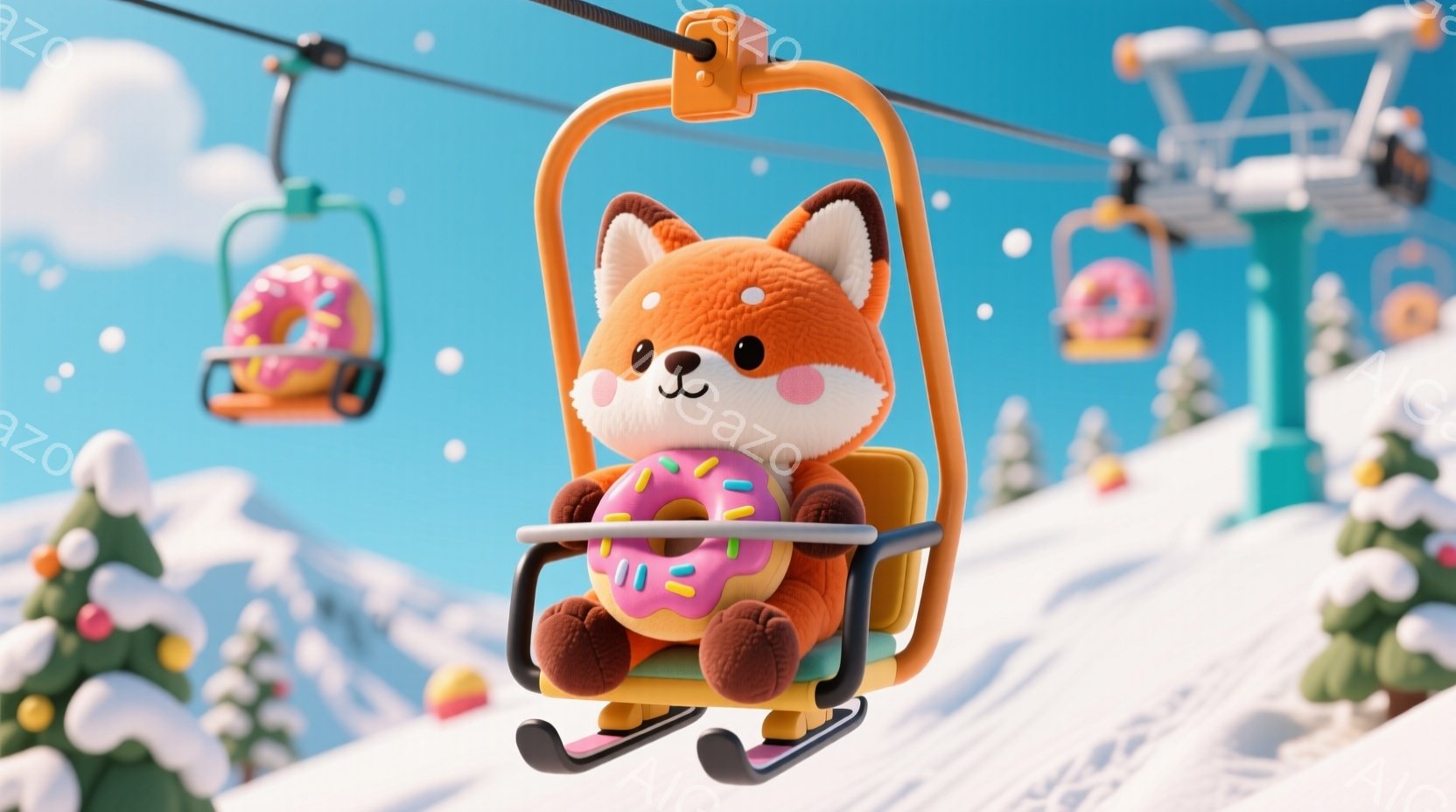 ふわふわのキツネのキャラクターが、ドーナツの形をしたクッションを抱きかかえ、スキーリフトに乗っています。キツネは緑色の蝶ネクタイをつけ、可愛らしい表情で、スキー板の上に乗ってリフトに乗っています。背景には雪山が広がり、青空と白い雪が印象的な冬の風景で、全体的に温かく、遊び心に満ちた雰囲気です。
