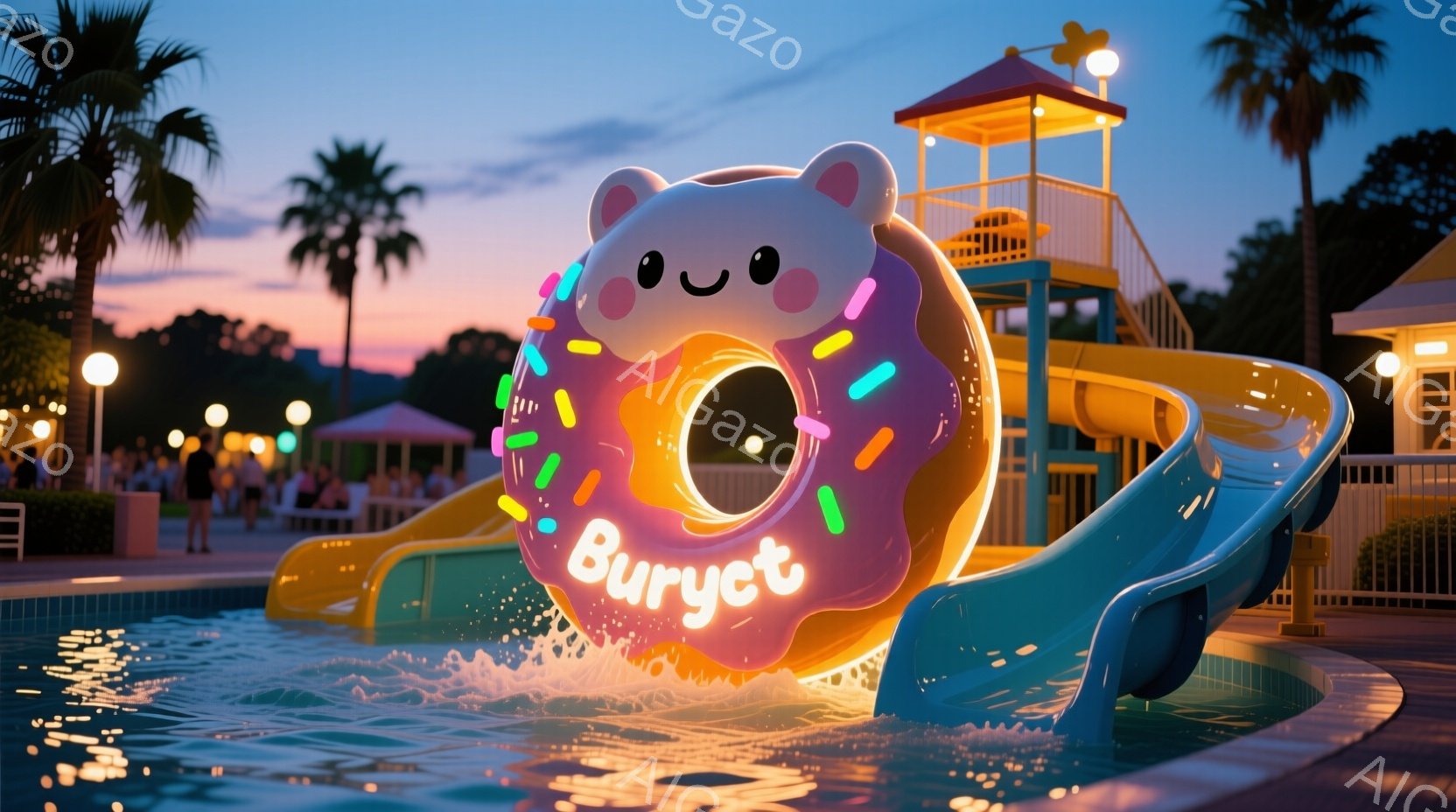 プールには大きなドーナツ型の浮き輪が浮かんでおり、「Buums」という文字が光っています。背景には、カラフルなスライドやパームツリー、そして夕暮れ時の空が広がり、楽しい夏の雰囲気を感じさせます。人々は水着姿でプールサイドにいて、楽しそうに過ごしている様子が伺えます。