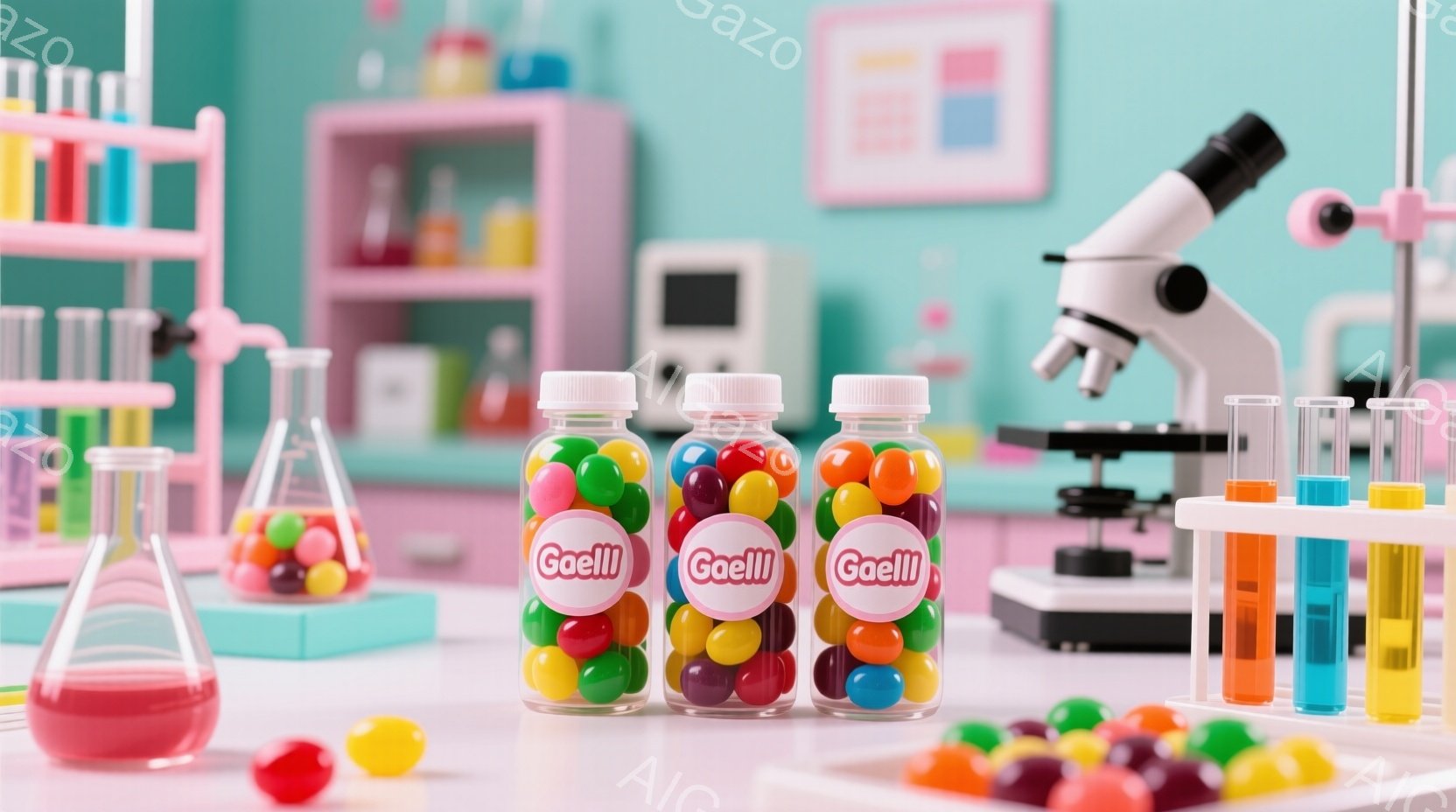 実験室を背景としたキャンディーのボトルのクローズアップです。3本のボトルにはカラフルなキャンディーが入っており、それぞれに「Ballei」というブランド名が書かれたラベルが付いています。背景には、顕微鏡、試験管、様々な実験器具が配置され、鮮やかで遊び心のある雰囲気を醸し出しています。