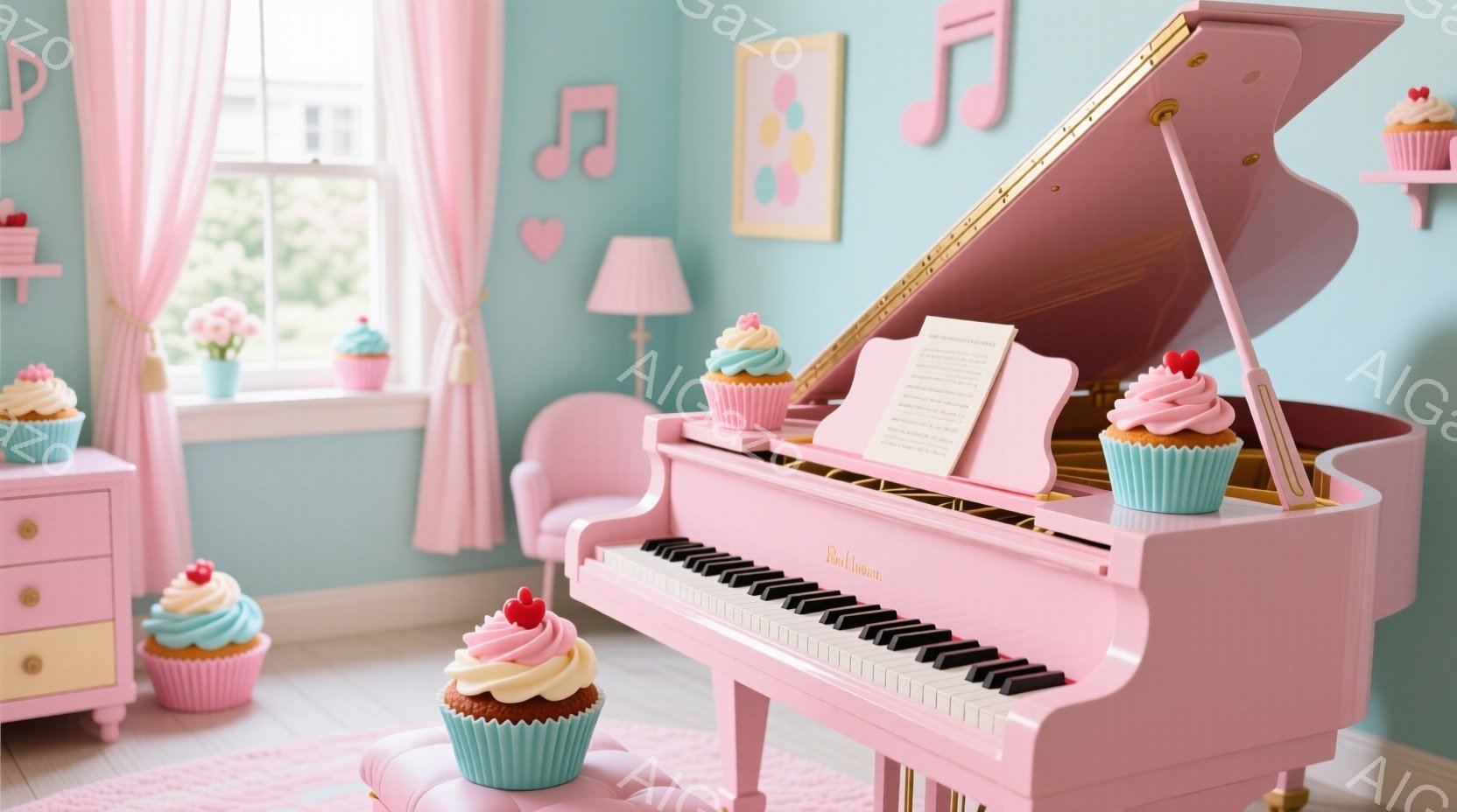 明るいピンクを基調とした部屋に、ピンクのグランドピアノが置かれています。ピアノの上や周囲には、クリームとチェリーが飾られた可愛らしいカップケーキがいくつか配置されており、全体的に甘く夢のような雰囲気を醸し出しています。背景には、窓と可愛らしい装飾が施された壁があり、部屋全体が柔らかく優しい色調で統一されています。