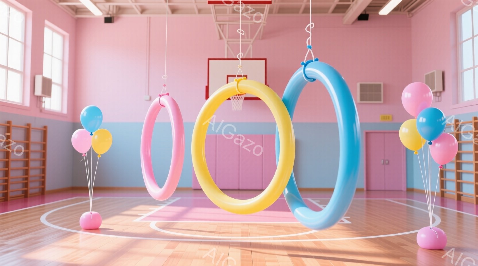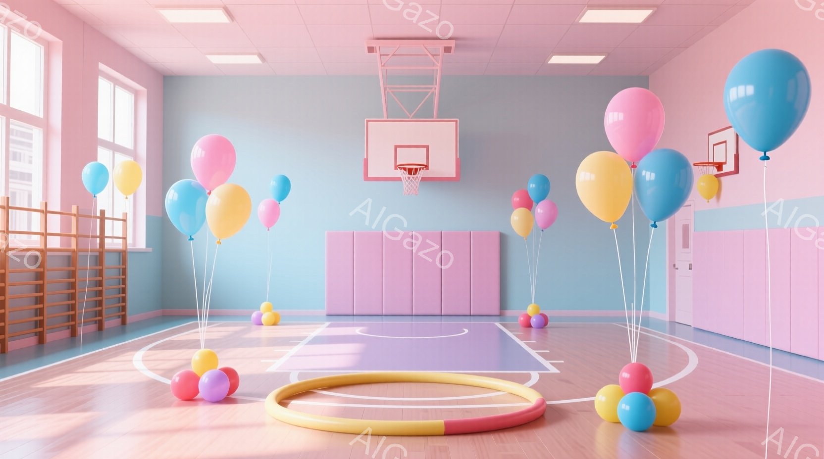 広々とした体育館の中央には、カラフルなリングがいくつか吊り下げられています。床にはバスケットボールコートのラインが引かれ、壁はピンクと水色で塗られ、明るく楽しい雰囲気です。天井からはたくさんの風船が垂れ下がっており、子供たちの誕生日会やイベントが行われる場所であることが想像できます。