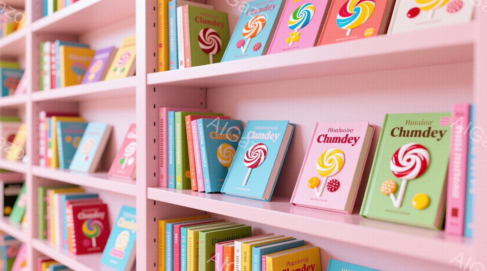 ピンク色の本棚が写っており、カラフルなキャンディのイラストが描かれた本が並んでいます。本棚は明るく、ポップな雰囲気で、子供部屋や遊び心のある空間に合うデザインです。全体的に甘くて楽しい気分になるような、視覚的に魅力的な画像です。