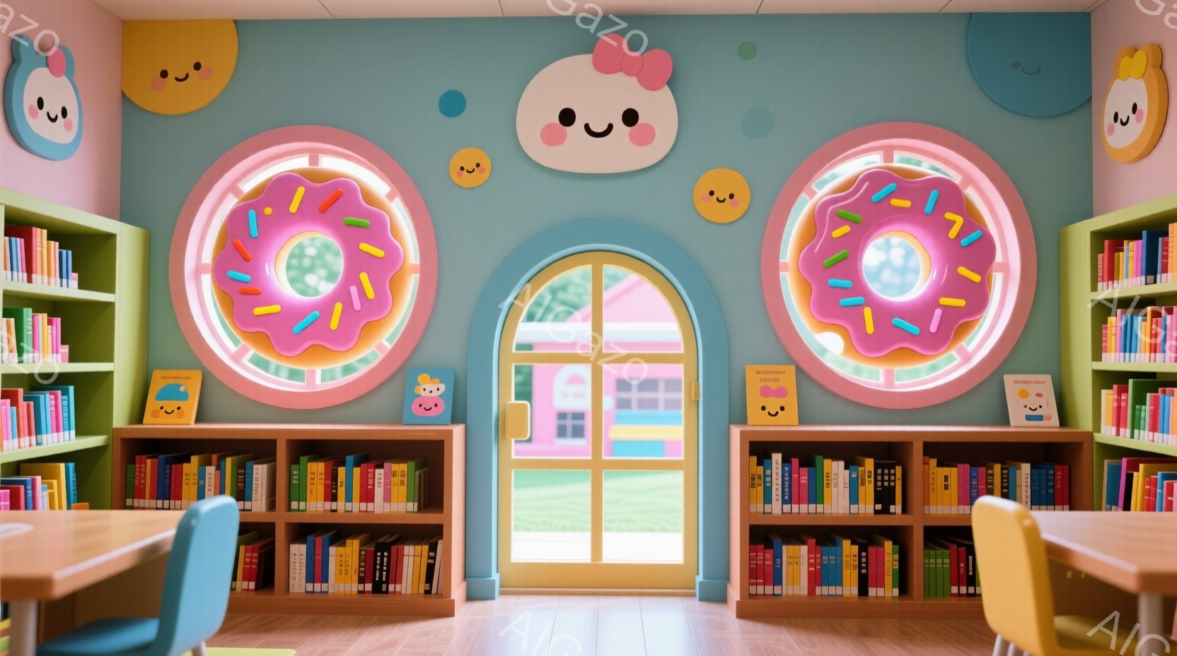 明るいピンク色を基調とした図書館で、大きなアーチ型の窓から外の景色が見えます。窓枠や本棚には可愛らしいキャラクターが描かれており、室内には白い机と椅子が整然と並んでいます。全体的に柔らかく温かい雰囲気で、子供たちが楽しく本を読むのに最適な空間です。