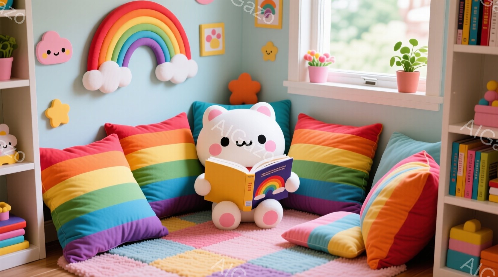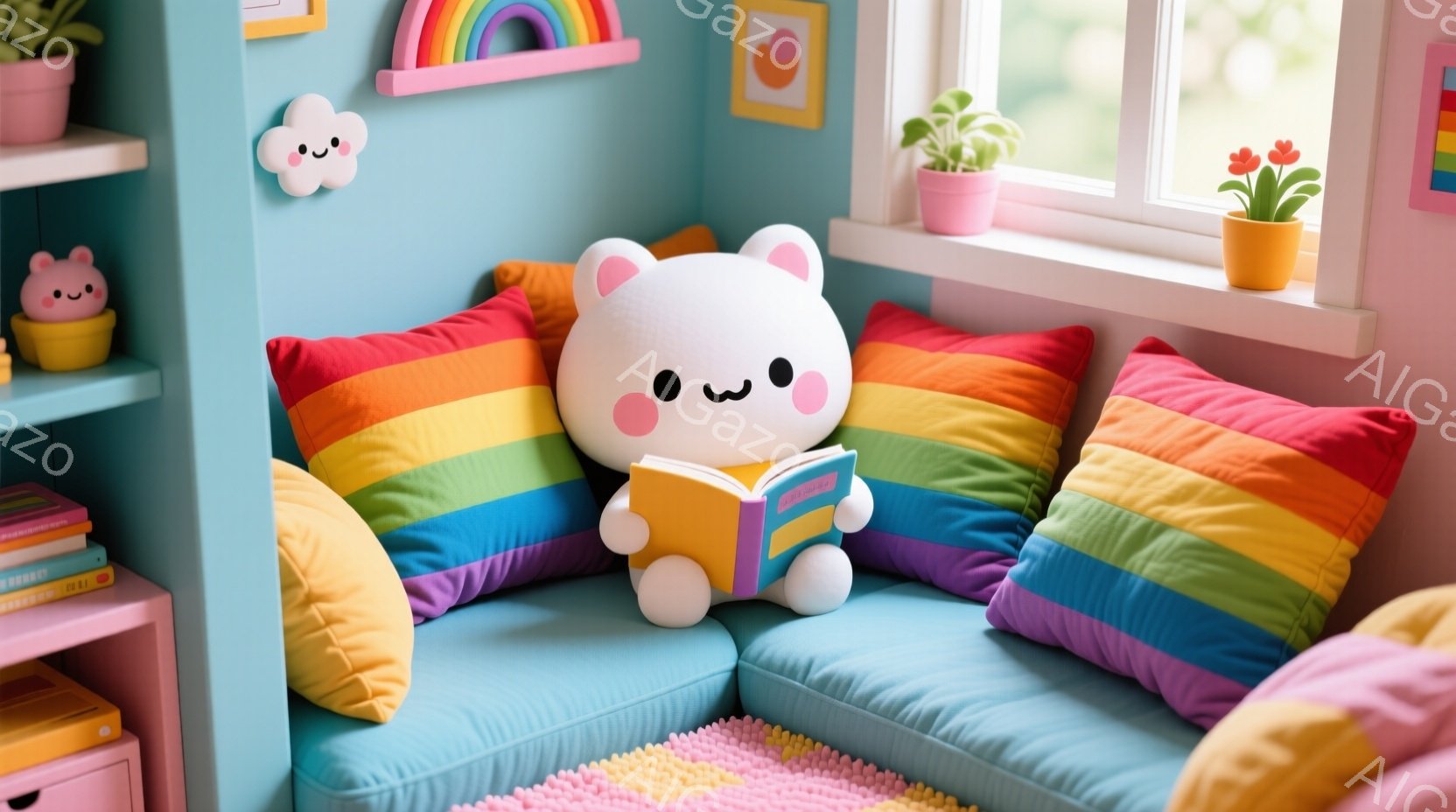 白くて丸いクマのぬいぐるみは、明るい色のクッションに座って本を読んでいます。背景には、虹色のクッション、本棚、鉢植えの植物があり、全体的に暖かく、遊び心のある雰囲気が漂っています。このクマは、幸せそうで、読書を楽しんでいるようです。