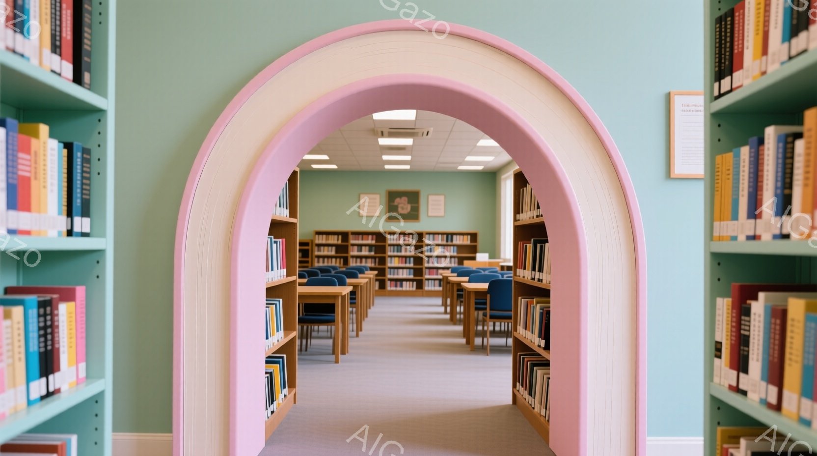 図書館のアーチ型の通路が写っており、奥には整然と並んだ書架が見える。通路の壁は淡いピンク色で、書架は木製で明るい色調で、全体的に静かで落ち着いた雰囲気である。床は木目調で、天井には蛍光灯が並び、図書館の清潔さと整然とした様子が強調されている。