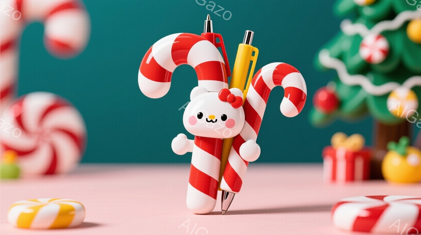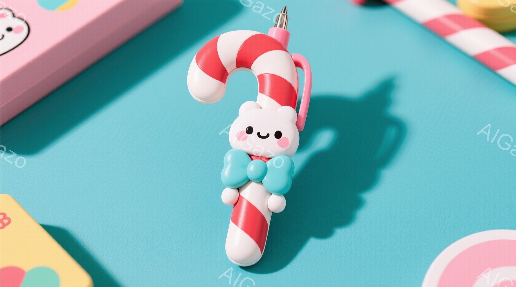 明るいピンク色の背景に、キャンディのようなデザインのペンが中央に配置されています。ペンは赤と白の縞模様で、上部には可愛らしい顔が描かれており、下部にはシャープペンシルの先があります。背景には、パステルカラーの積み重ねられたブロックと、小さな球体、そしてカラフルな旗のような装飾が見られ、全体的にポップで楽しい雰囲気です。