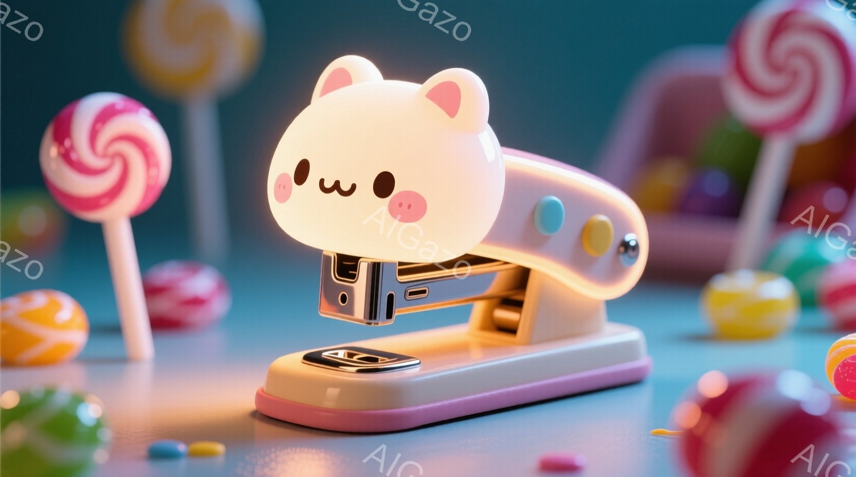 鮮やかなキャンディに囲まれた、かわいらしいステープラーが中央に配置されています。ステープラーは白いウサギのような形をしており、つぶらな瞳とほのかな笑顔が特徴的です。背景はパステルカラーで彩られ、遊び心あふれるお菓子の世界が表現されています。