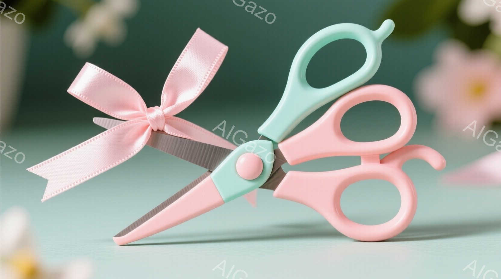 薄いピンク色の切れ端が添えられた水色のハサミが、緑色の背景に置かれています。ハサミは開いており、切れ端は少しカールしています。全体的に、何かを切り開く、または新しい始まりを象徴するような、明るく軽やかな印象を与えます。