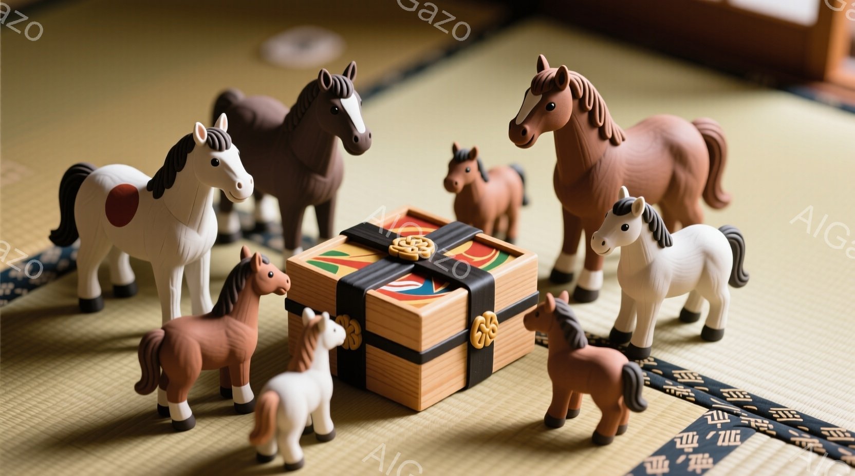 畳の上に、木製の箱が置かれており、その周りを馬の置物が囲んでいます。馬は茶色、白、栗毛の様々な色をしており、それぞれ少しずつ姿勢が異なっています。全体的に落ち着いた雰囲気で、伝統的な日本のインテリアと調和しています。