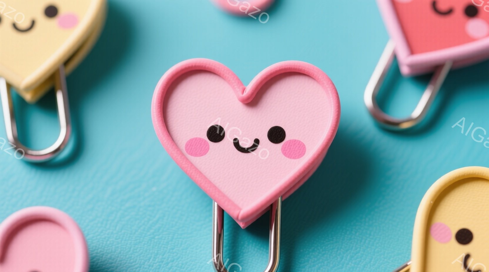 明るい水色の背景に、可愛らしいハート型のクリップが散りばめられています。クリップはピンクと黄色の2色で、それぞれつぶらな瞳と微笑みを浮かべており、愛らしい雰囲気を醸し出しています。緑色のクリップもいくつか混ざっており、全体的にポップで遊び心のある印象を与えます。