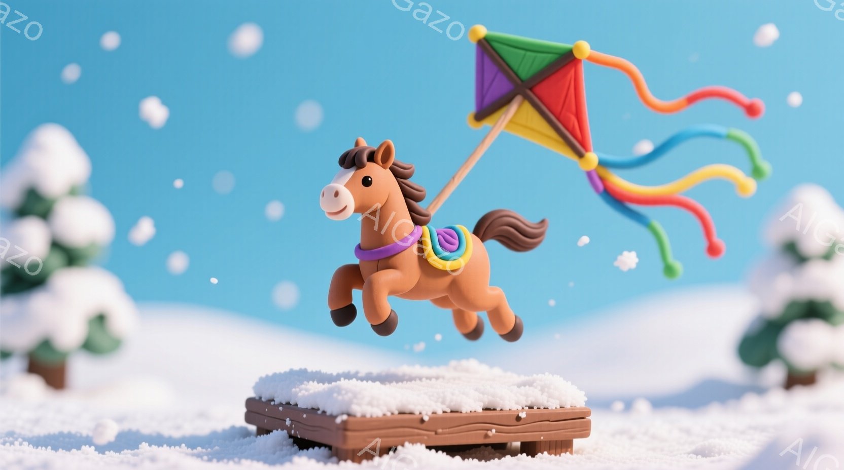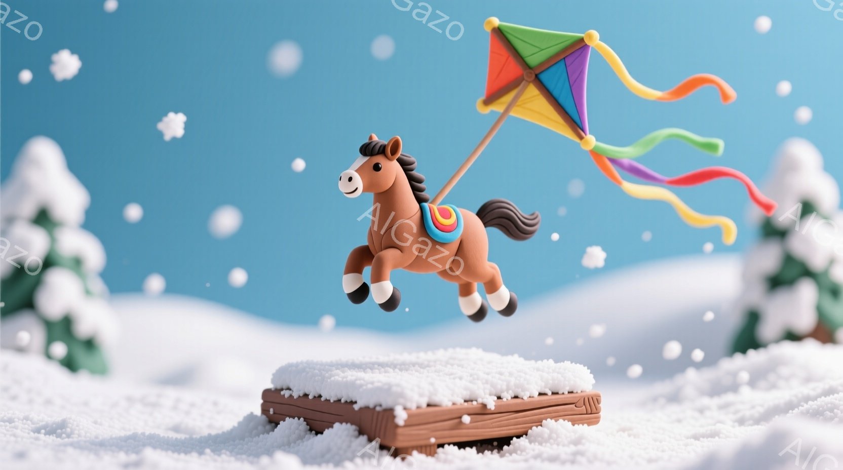 この無料AI生成画像「茶色の馬が雪の上に置かれた木の台の上でジャンプしている様子が描かれています。馬は赤い帯で飾られ、首周りには茶色のたてがみがあります。背景には雪で覆われた木々が立ち並び、雪が舞い散る冬の景色が広がっています。」は、2025年10月22日に作成されました。 サイズは 1664×928px の高解像度で、商用利用も可能なフリー素材として提供しています。