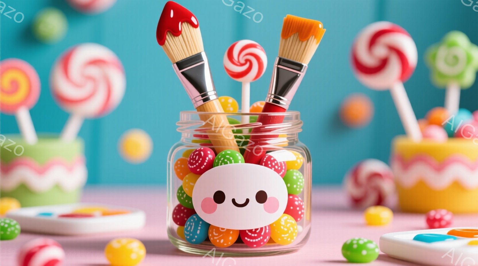 カラフルなキャンディと絵筆が詰まったガラスの瓶が中央にあります。瓶の前面には、可愛らしい笑顔の白い猫の顔が描かれており、背景にはパレットやカラフルな棒付きキャンディ、お城のような建物が見えます。全体的に明るく、お祭りや子供の遊びを連想させる、楽しい雰囲気が漂っています。