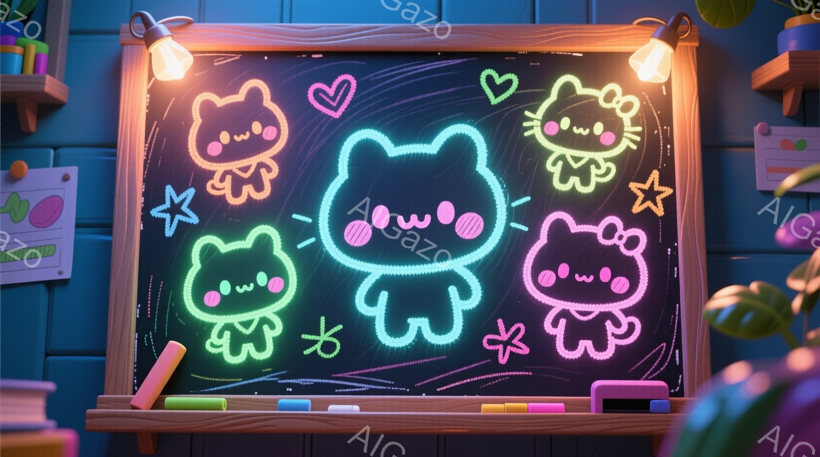 蛍光色の線で描かれたハローキティのイラストが黒板に三つ並んでいます。キティはそれぞれピンクのリボンをつけており、可愛らしい笑顔を浮かべています。背景には紫色の壁と本棚、そして点灯した電球があり、温かく楽しい雰囲気が漂っています。