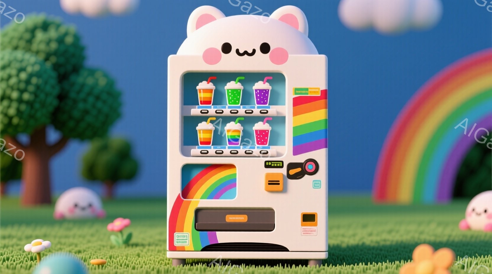 カラフルな背景の中に、かわいらしい自販機が描かれています。自販機は白を基調とし、目の表情や小さな口が特徴的で、まるで生きているかのような愛らしさを表現しています。背景には、虹色のアーチや緑の丘、雲が配置され、ファンタジックで夢のような雰囲気を醸し出しています。