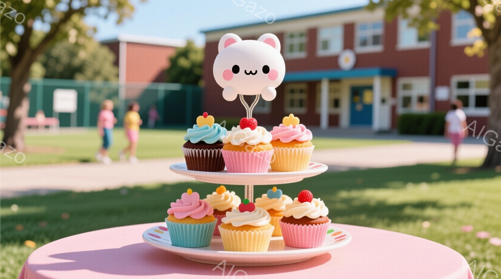 ピンク色のテーブルの上に、三段重ねのケーキスタンドが置かれており、カラフルなカップケーキが並んでいます。背景にはレンガ造りの学校建物が見え、青空の下、穏やかな春の日のような雰囲気が漂っています。テーブルの上には、キャンディーのような小さな飾りも散らされており、可愛らしい印象を与えます。