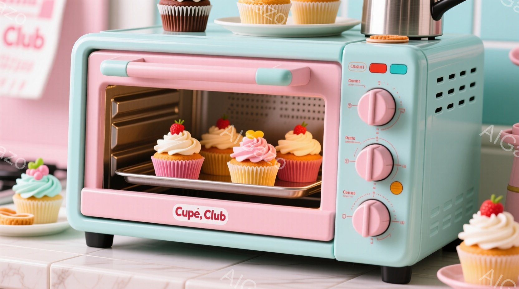 薄いピンクと水色のレトロなトースターが写っており、中にはカラフルなカップケーキが並んでいる。背景はパステルカラーのキッチンで、調理器具や鍋が配置されており、全体的に甘くて可愛らしい雰囲気が漂っている。トースターの正面には「Coplub」という文字が書かれたロゴがある。