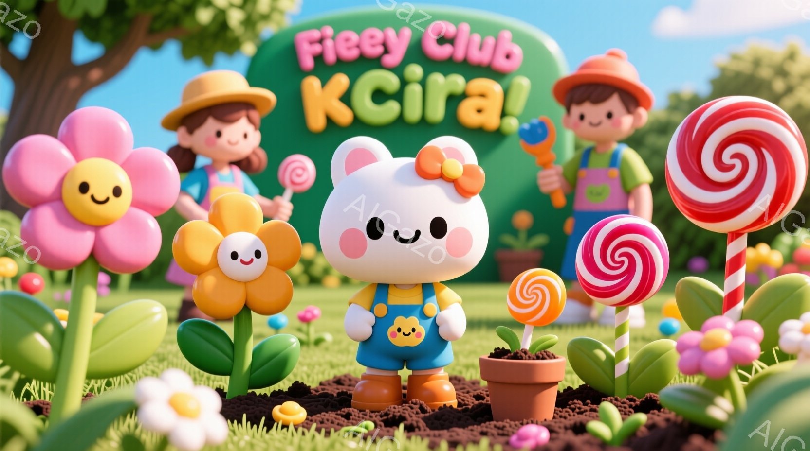 明るい緑の芝生の上に、可愛らしいキャラクターたちが並んでいます。それぞれ異なる色の帽子と服を着ており、笑顔で何かを育てているようです。背景にはカラフルな花やキャンディーのような装飾があり、まるで夢のようなガーデンです。