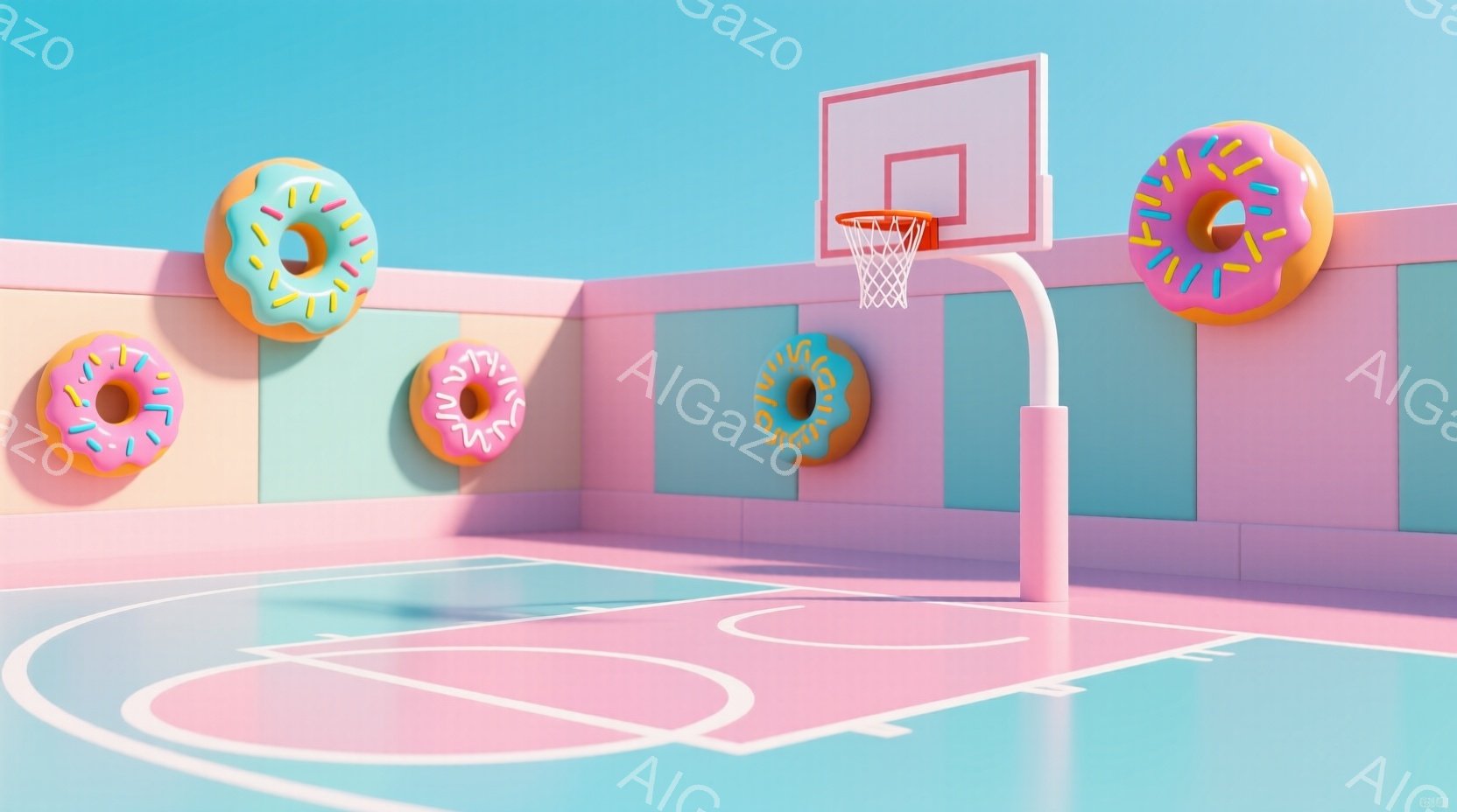 明るいピンクのバスケットボールコートの中に、様々な色のドーナツが浮かび、または転がっています。背景はパステルピンクの壁と床で、全体的にポップでカラフルな雰囲気です。ドーナツとバスケットボールゴールの組み合わせが、遊び心溢れる空間を作り出しています。