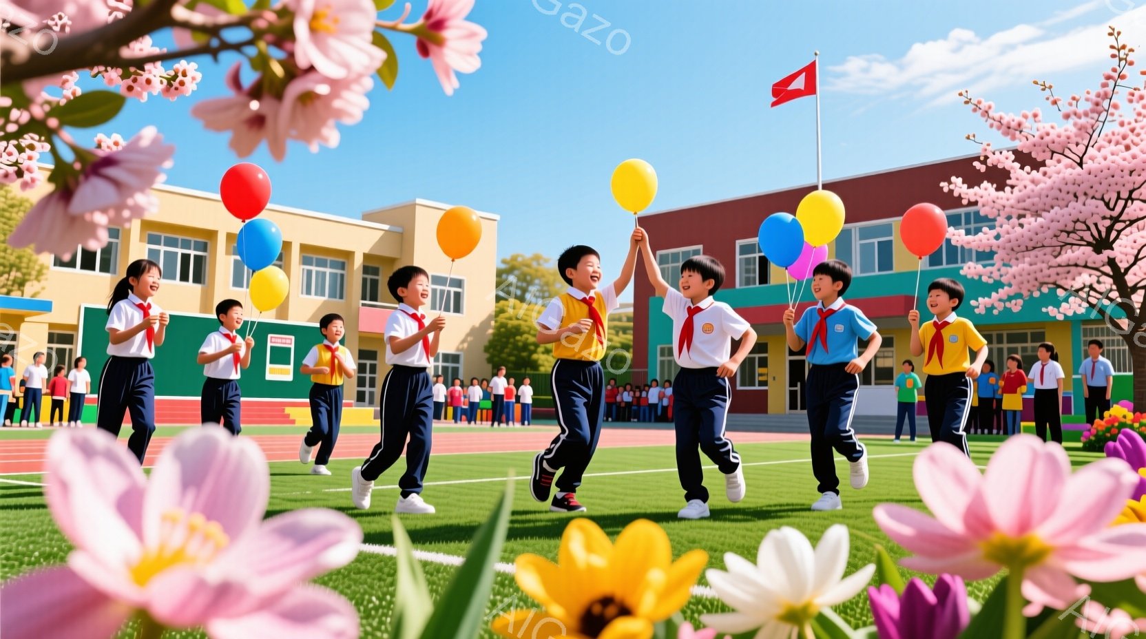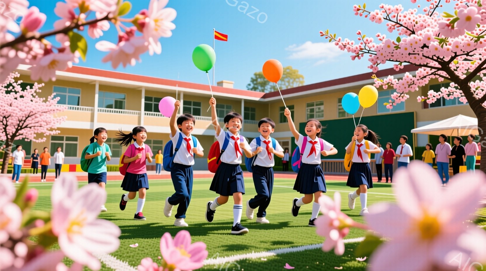 学校の芝生広場を子供たちが楽しそうに走っている様子が描かれています。子供たちはカラフルなスポーツウェアを着ており、様々な髪型で、笑顔や真剣な表情を浮かべています。背景にはレンガ造りの建物と、満開の桜並木、そして青空が広がり、春の暖かな一日を思わせる、活気に満ちた雰囲気です。
