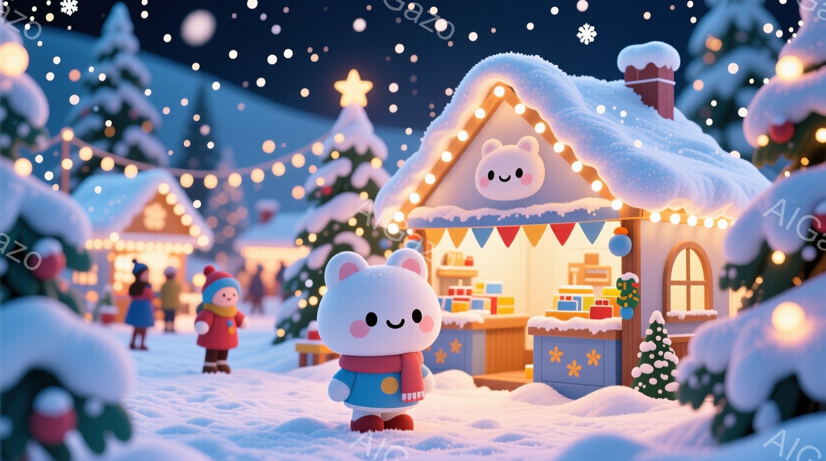雪が降るクリスマスの夜の風景で、中央には可愛らしい白いクマのキャラクターが立っています。赤い帽子とマフラーを巻き、白いコートを着ており、丸い頬と穏やかな笑顔が印象的です。背景には、雪で覆われた可愛らしい家々が並び、温かい光が灯っており、全体的に暖かく、お祝いムードにあふれた雰囲気です。
