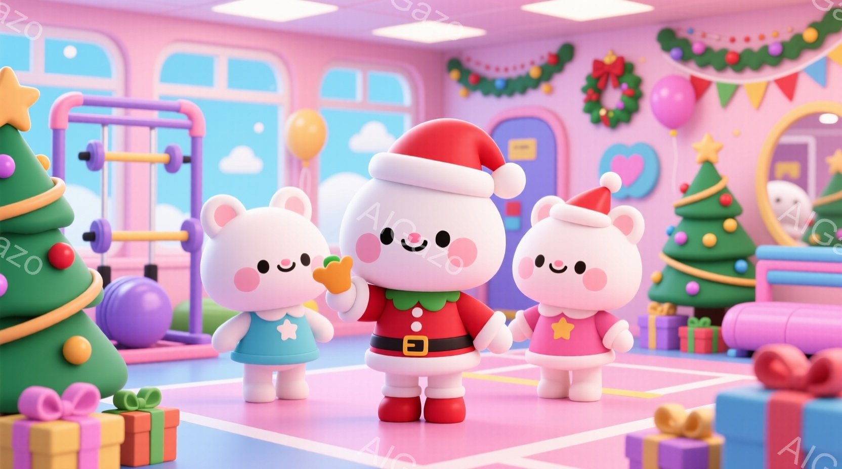 クリスマスツリーの周りに並んだ、サンタの帽子をかぶった可愛らしい動物たちが描かれています。ピンク、赤、緑、青の動物たちは、緑と白のストライプのズボンと赤いコートを着ており、それぞれ楽しそうな笑顔を見せています。背景にはプレゼントや飾り付けが施されたクリスマスツリー、そしてピンクと水色の建物があり、全体的に暖かく、お祝いムードに満ちた雰囲気です。