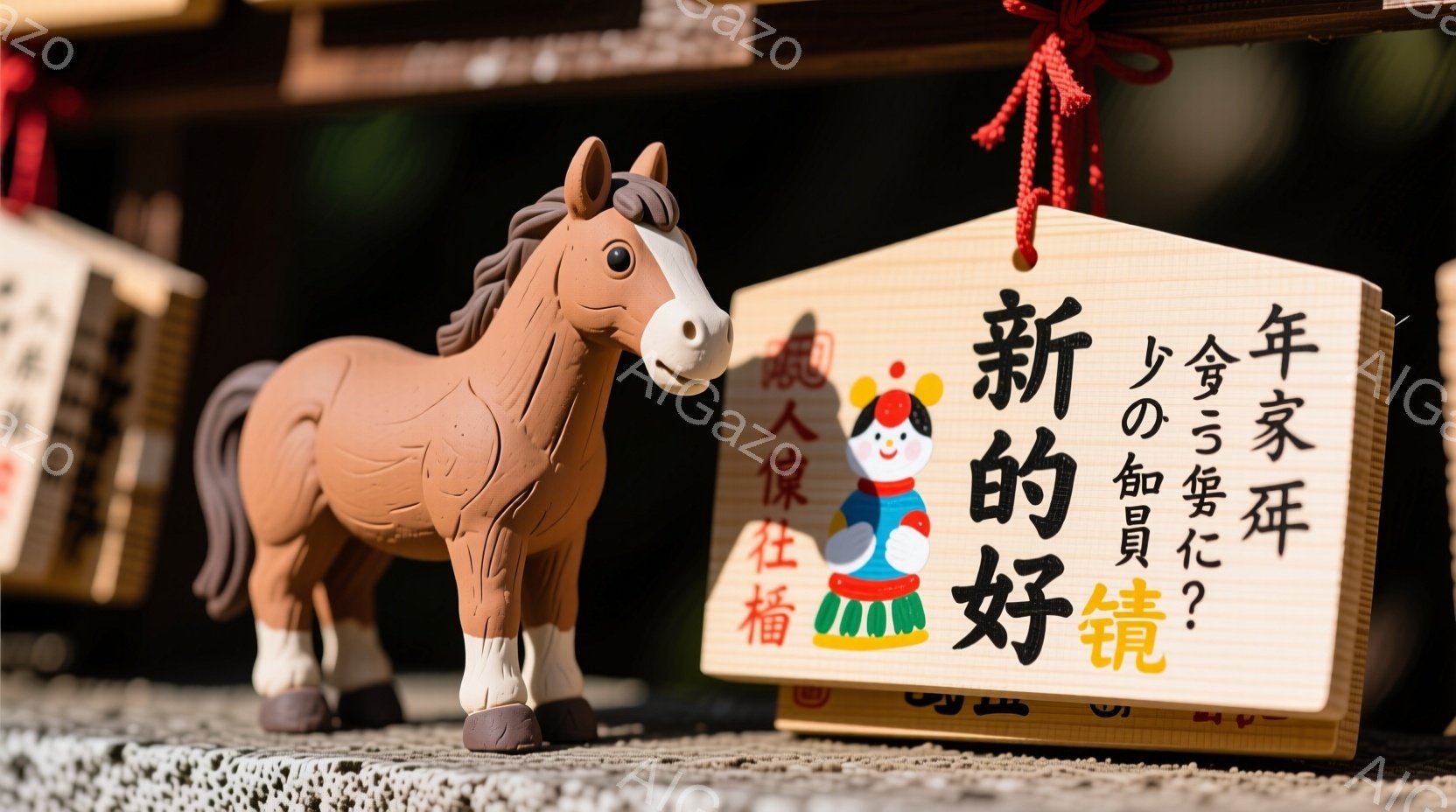 茶色い陶器製の馬の置物が、赤い鞍を背負って立っている。背景には、書道で「新年」と書かれた木製の絵馬がいくつか並び、床には小石が敷き詰められている。全体的に、日本の伝統的なお正月を祝う温かく、穏やかな雰囲気が漂っている。