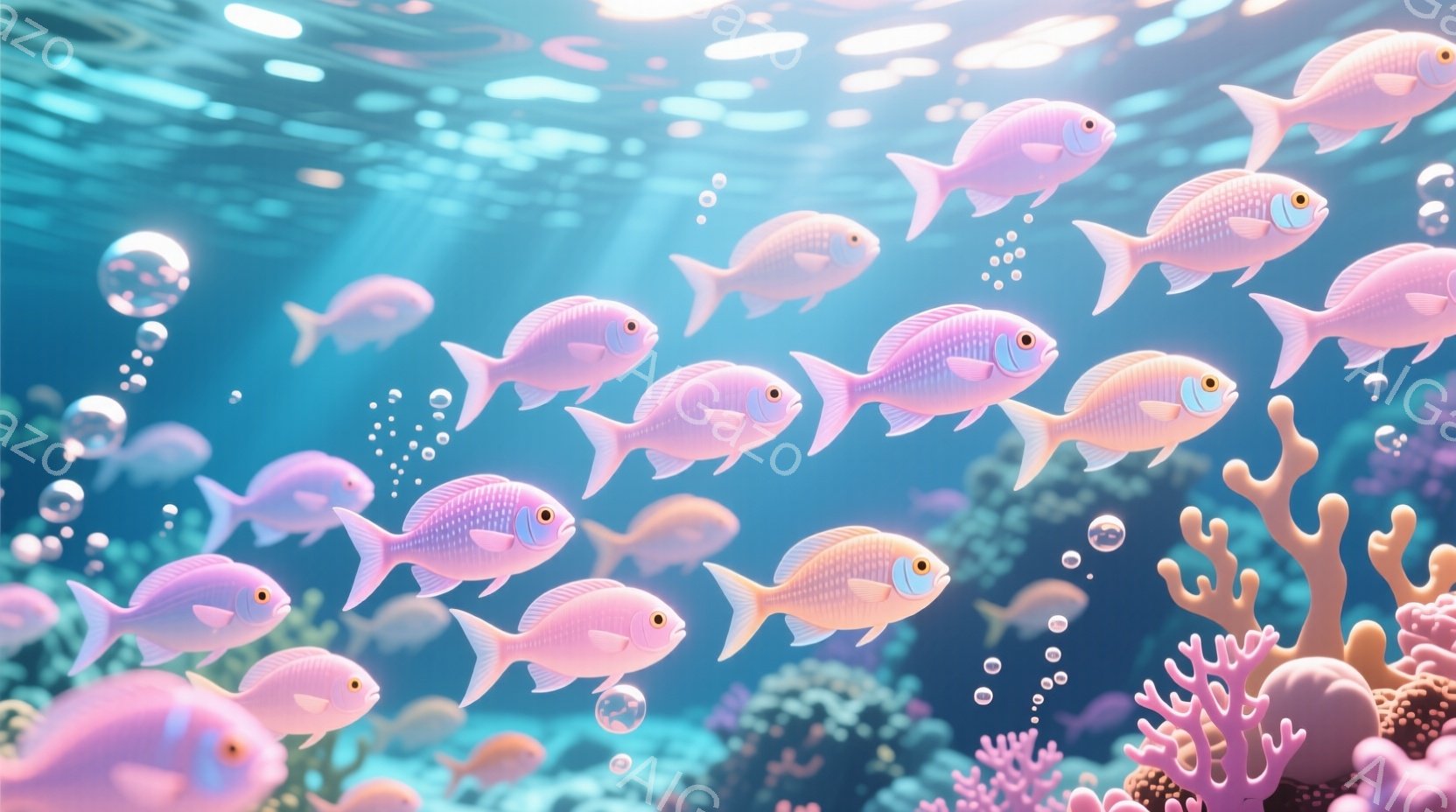ピンクとオレンジ色の魚の群れが水中で泳いでいる様子が描かれています。背景には、ピンク色のサンゴ礁や海藻が見え、水中に泡が浮かんでいます。全体的に穏やかで幻想的な雰囲気で、水中の美しい世界が表現されています。