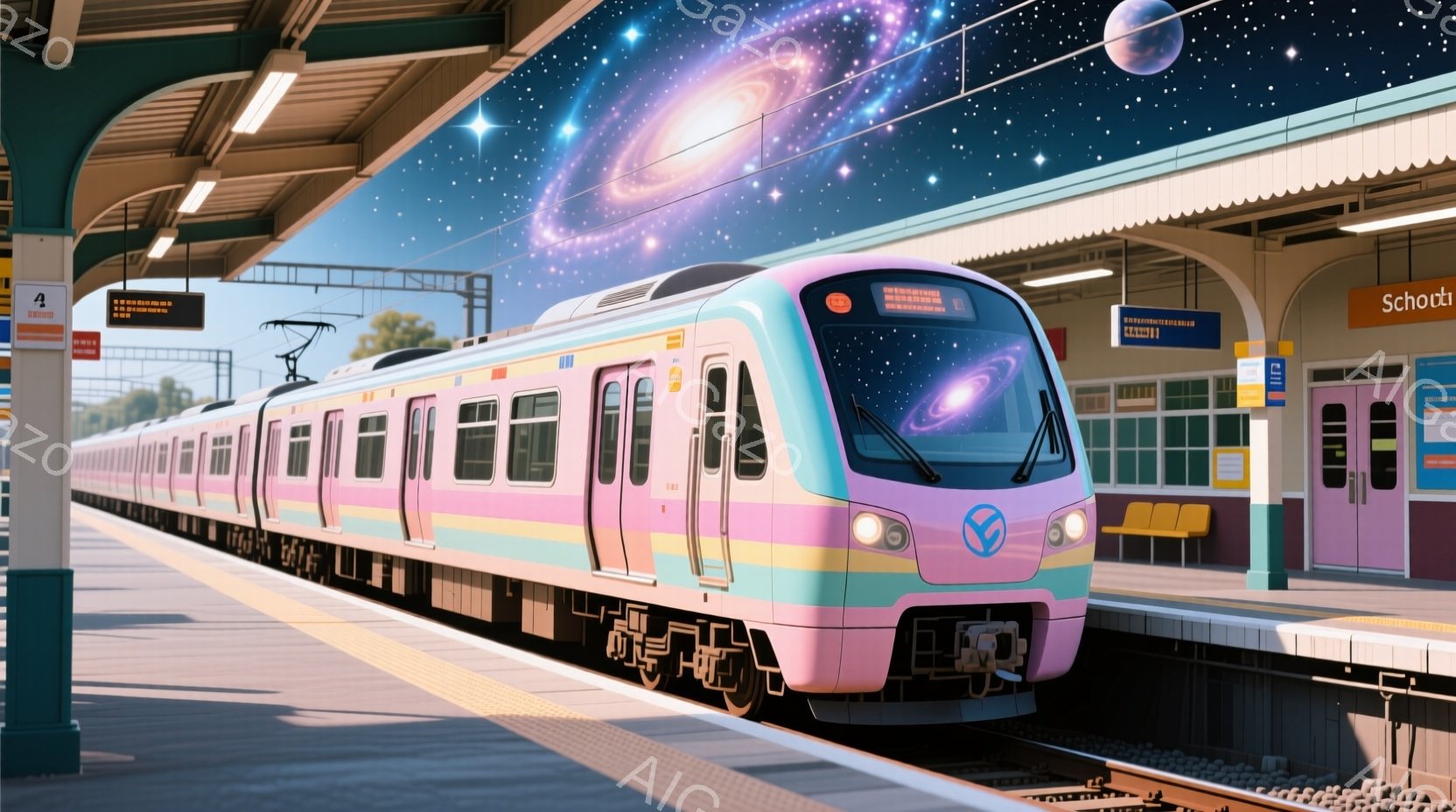 鮮やかなピンクと紫色の列車が駅のプラットフォームに停車しており、背景には星雲が広がり幻想的な雰囲気を醸し出しています。 駅の看板や照明が列車を照らし、未来的な光景を強調しています。 全体的に、夢のような、あるいは異世界への旅立ちを連想させるイメージです。