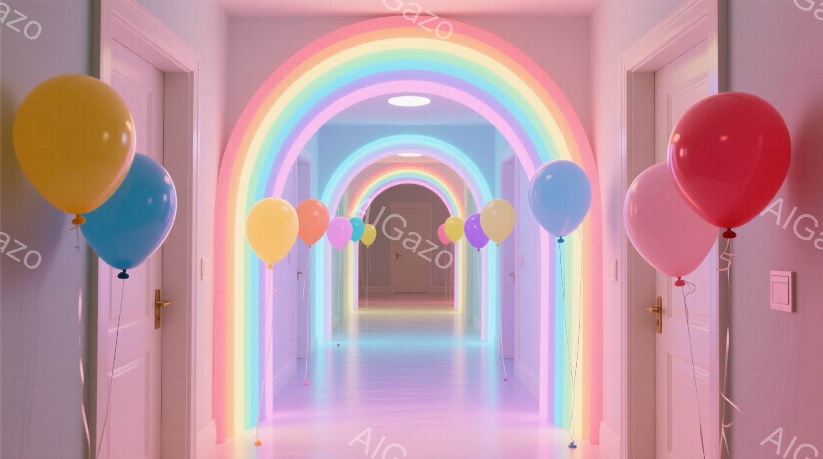 薄いピンク色の廊下に、虹色の光がアーチ状に並んでいます。白のドアが等間隔に配置され、それぞれのドアには金色の取っ手が付いています。カラフルな風船が廊下の両側に浮かんでおり、お祝いや楽しい雰囲気を演出しています。