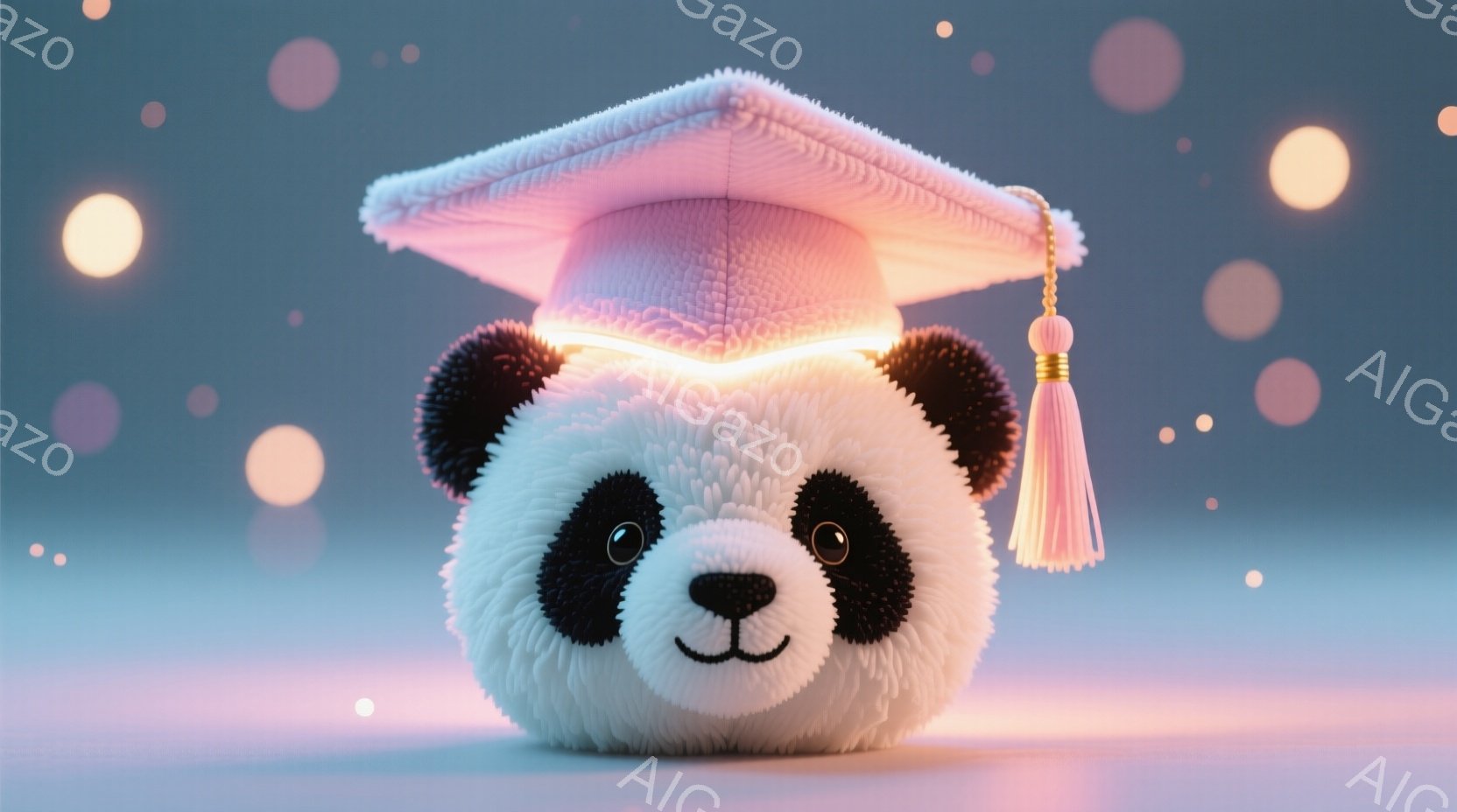 白黒のパンダが、卒業式で着用するような、タッセル付きの角帽をかぶっています。パンダは正面を見据え、穏やかな微笑みを浮かべており、ふっくらとした体型と愛らしい表情が特徴です。背景は淡いピンクと紫のグラデーションで、柔らかく暖かな雰囲気を醸し出しています。