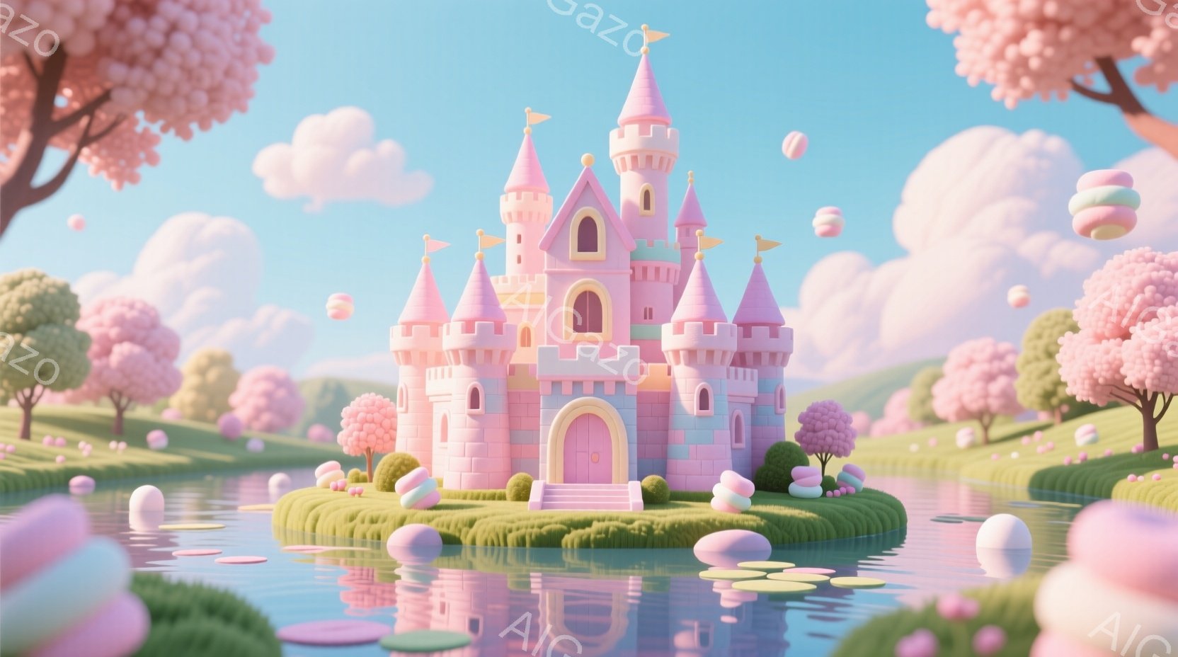私たちは、童話のような楽しい場所にある大きなお城を見つけます。その周りには、ピンク色が多いです。天気は晴れており、日光が明るく、楽しい雰囲気が漂っています。