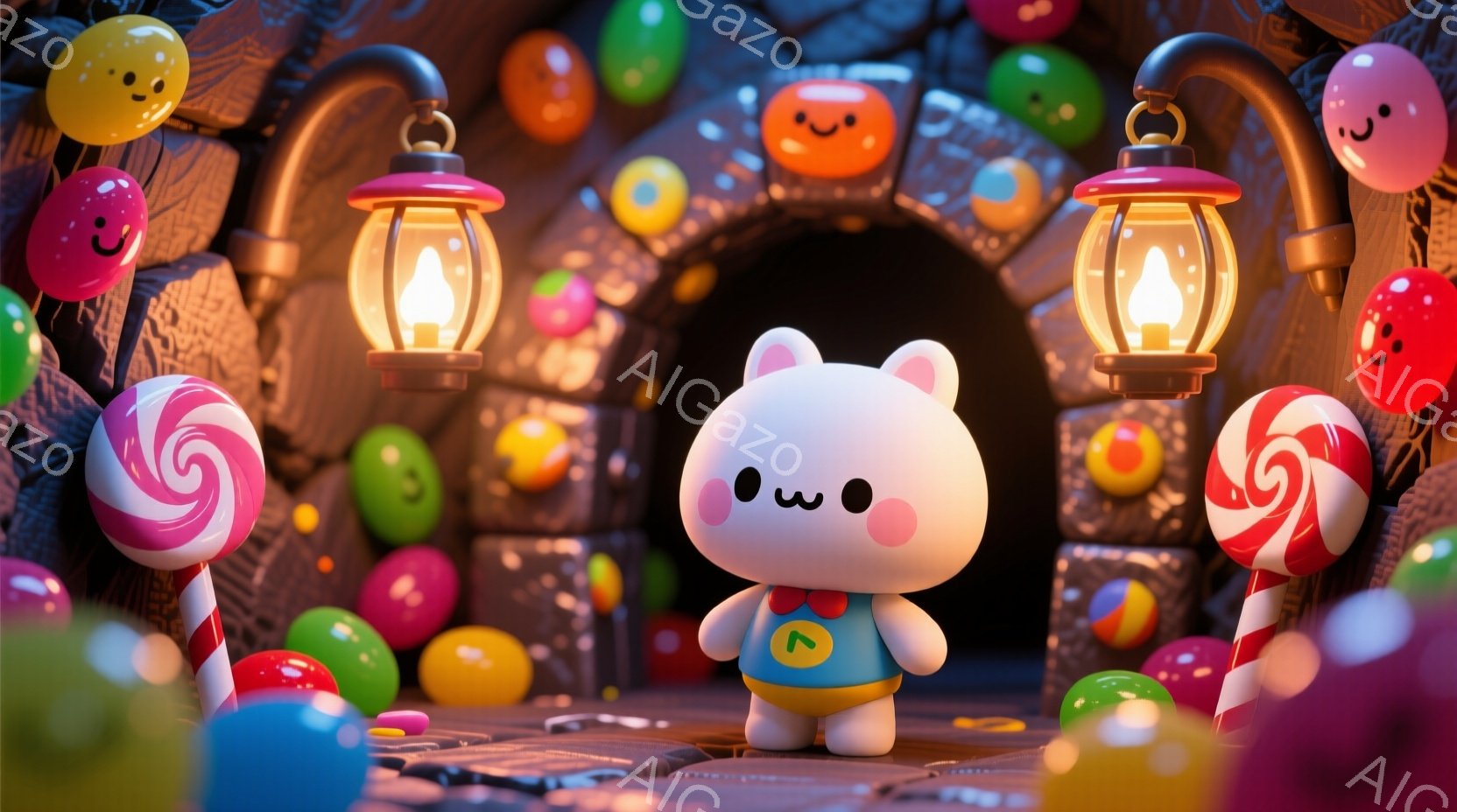 白い子犬のようなキャラクターが、キャンディがたくさん散らばるトンネルの中に立っています。キャラクターは赤いバンダナをつけており、丸くて可愛らしい顔つきで、楽しそうな表情をしています。背景にはカラフルなキャンディや棒付きキャンディが散りばめられ、トンネルの壁は石造りで、薄暗い照明が幻想的な雰囲気を醸し出しています。