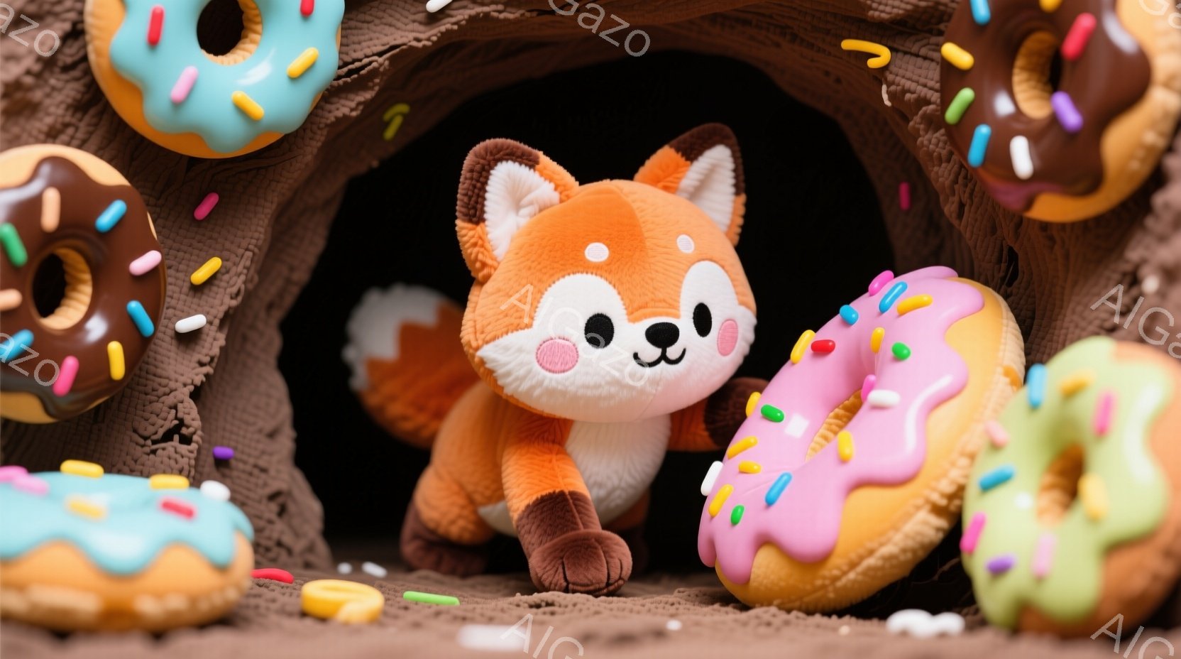 ふわふわのオレンジ色のキツネのぬいぐるみは、緑色の短い芝生の上に座って、ピンク色のアイシングと黄色いスプリンクルが付いた大きなドーナツの隣にいます。背景はチョコレート色の壁で、周囲には様々な色のドーナツとカラフルなスプリンクルが散りばめられています。全体的に、明るく可愛らしい、お菓子のような雰囲気です。
