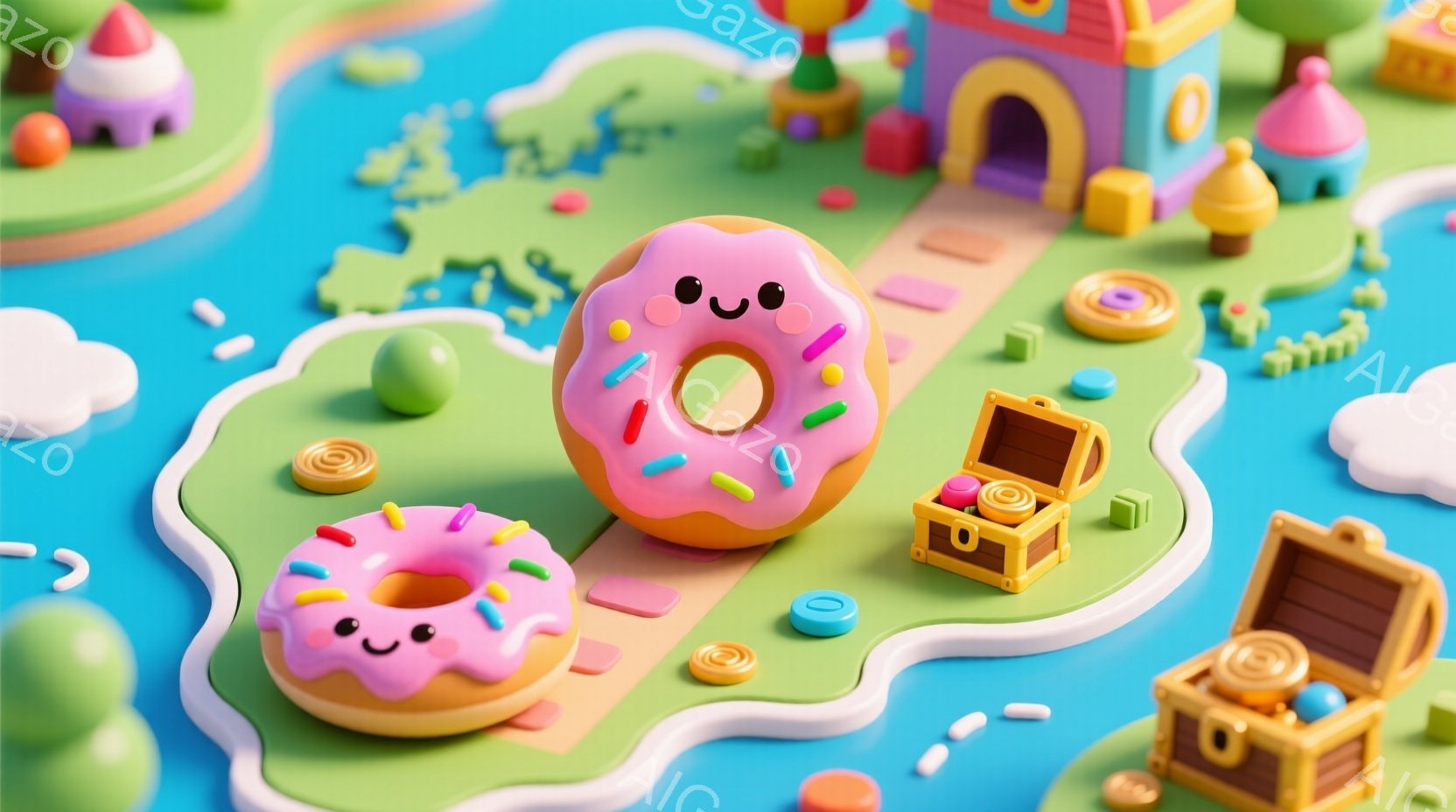 デジタルアート風の画像で、ポップなカラフルなキャラクターが中心で、軽快な気分を感じます。キャラは大きくお菓子のような顔をしている。畑や小川があり、そこには宝箱が置かれています。背景には様々な色彩豊かな建物があり、全体として幸せで楽しい雰囲気を維持しています。