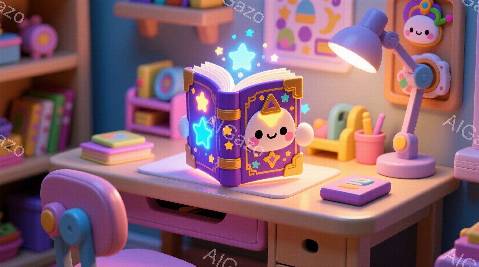 明るい紫色の机の上に、星の装飾がされた開いた青い本があり、中から光の粒子が舞い上がっている。本のページには、丸くて可愛らしい白い生き物が描かれており、穏やかな表情をしている。背景には、おもちゃや本棚などのカラフルな家具が見え、全体的にファンタジーで夢のような雰囲気を醸し出している。