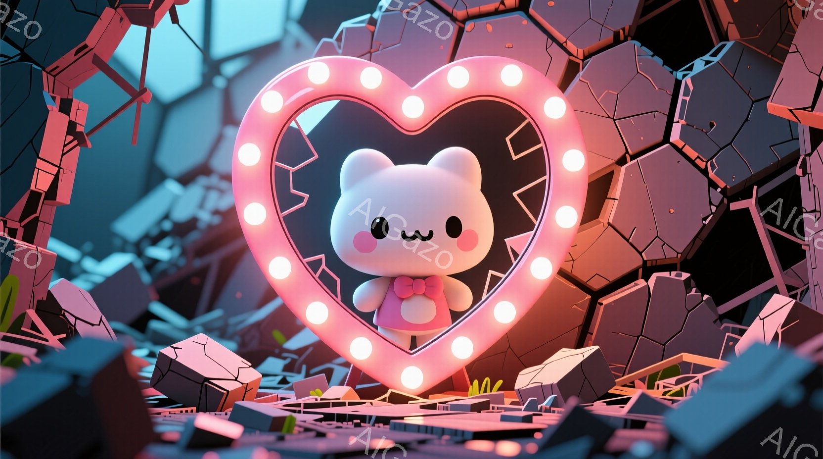 可愛らしいピンク色の猫のイラストが、光るハート型のフレームの中に描かれています。猫は赤いリボンをつけており、つぶらな瞳で微笑んでいます。背景は崩れかけた幾何学的な建造物で満たされており、どこか未来的な廃墟のような雰囲気です。